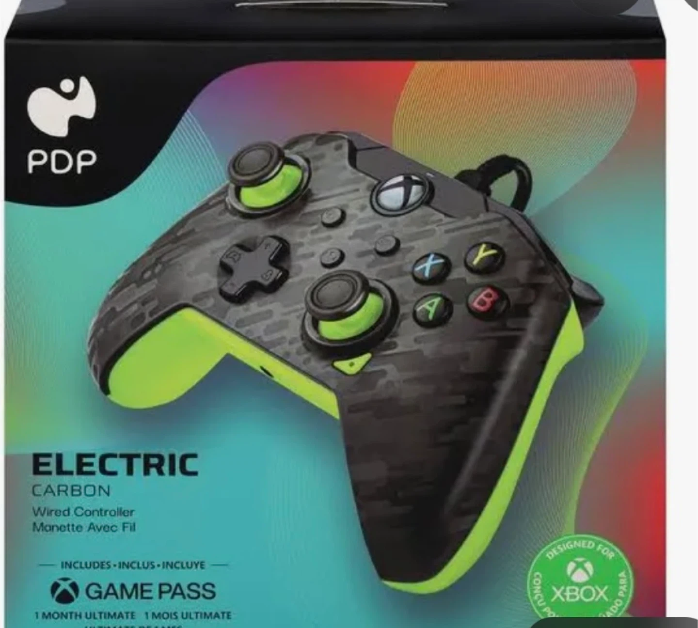 15Selling a PDP Electric Carbon wired controller for Xbox. It's in great shape and ready for a new home! Features a sleek design and comfortable grip for hours of gaming fun!