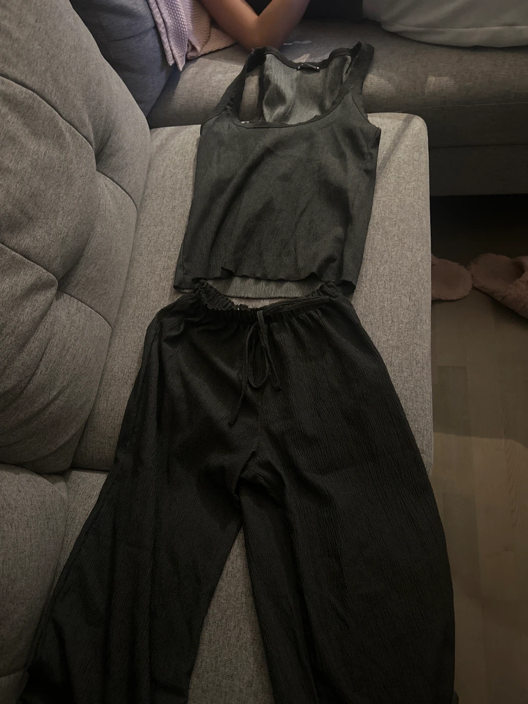 Selling a cute black tank top and pants set. The material has a crinkled texture. Perfect for lounging or wearing out and about