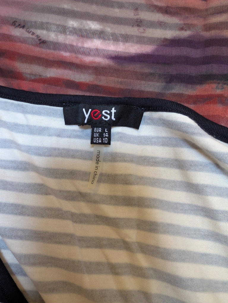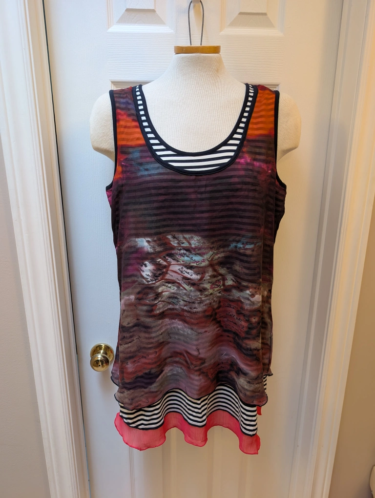 Here's a Yest tank top in size L. It features a unique design with stripes and a colourful pattern. Perfect for layering or wearing on its own! Porch Pick up Ajax Church and Delaney Please see My profile for more items