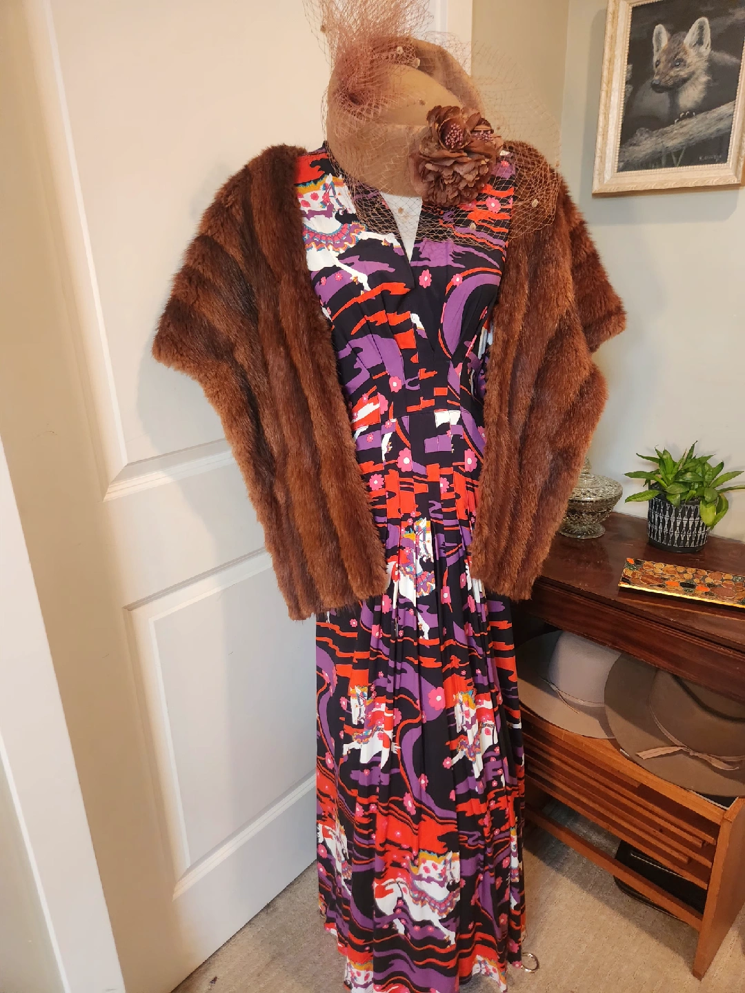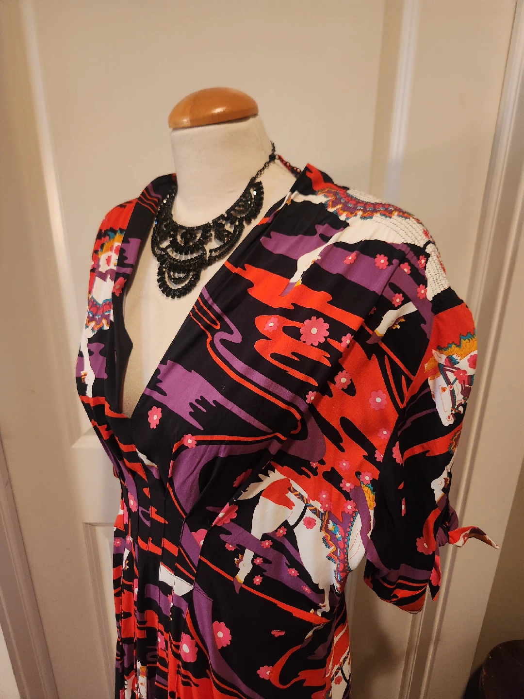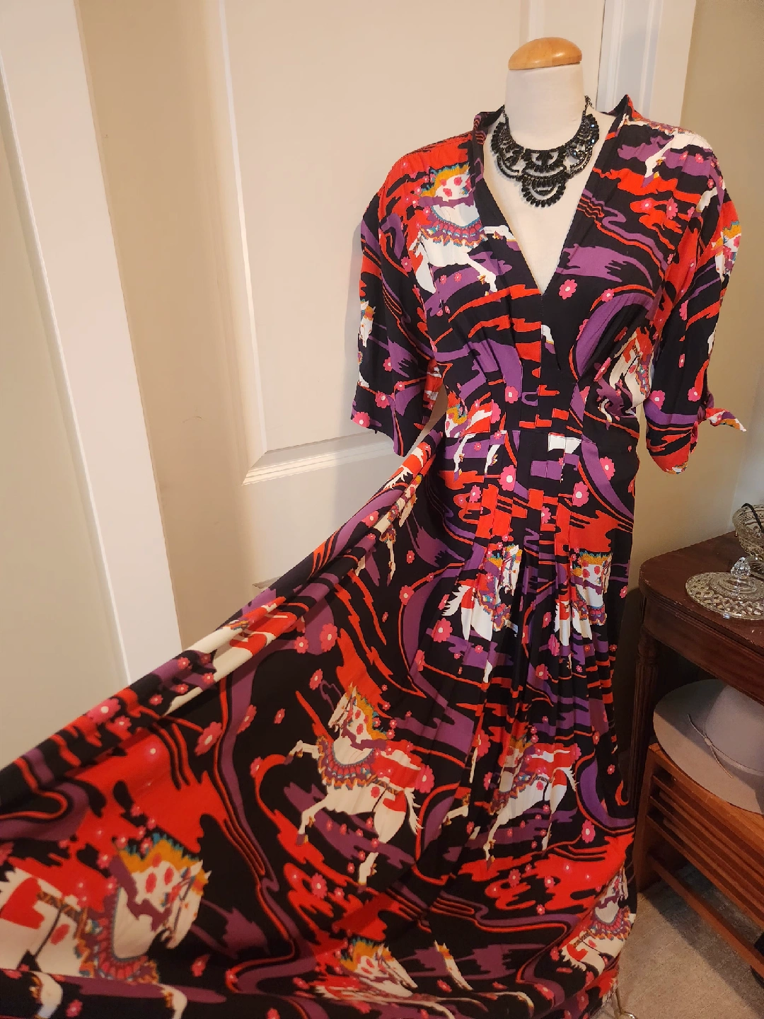 This brand is not sold in Canada.VERY FLATTERING plus size dress! Tie Sleeve size 22 (fits 20, 22, 24) fit and flare gown from boutique brand TRASHY DIVA full length dress with a Carousel Ponies design. It's a vibrant and eye-catching piece! Fabric has slight stretch for flattering silhouette. Hidden side zipper Purchased in New Orleans from exclusive Plus size friendly boutique TRASHY DIVA The original price was $225.00 US DOLLARS. Perfect holloween event dress. Looks wonderful with full lenght gloves! FANTASTIC QUALITY, UNIQUE DESIGN