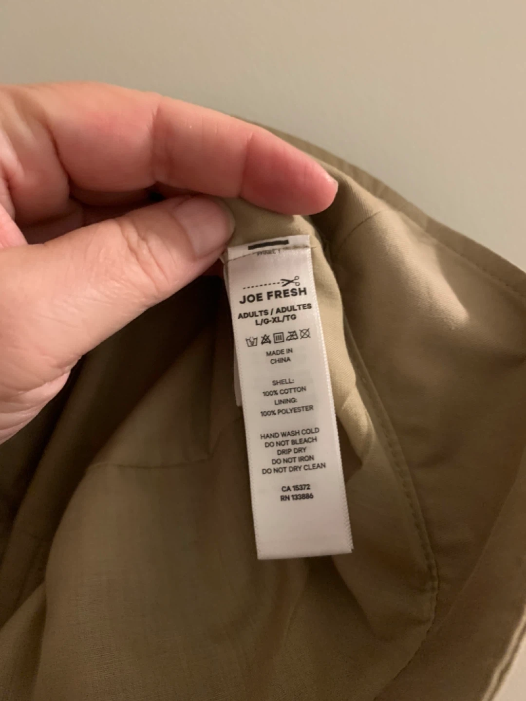 Joe Fresh bucket hat, size large/x-large. It's a stylish hat made with a shell of 100% cotton and a lining of 100% polyester