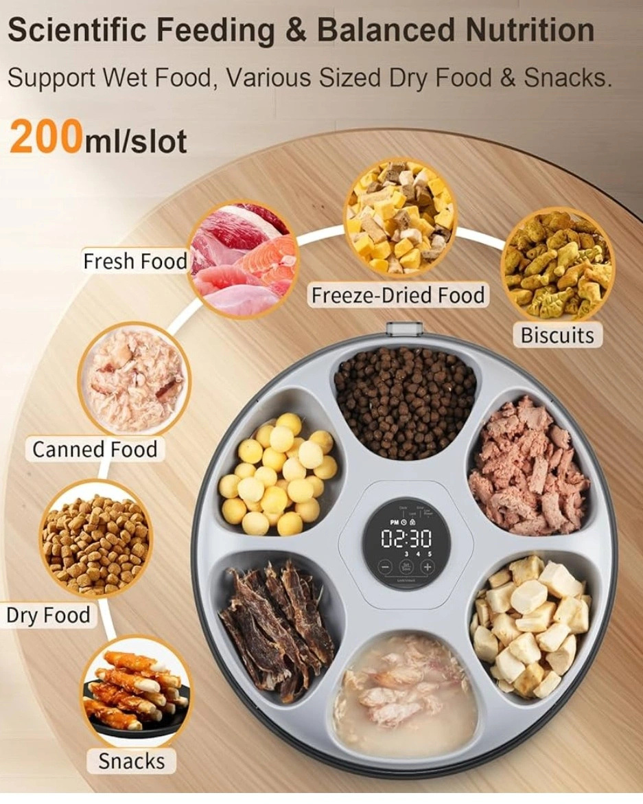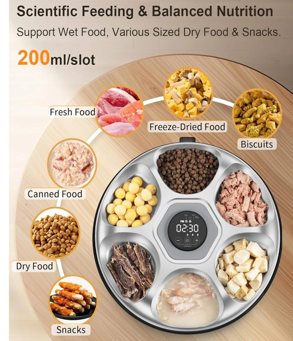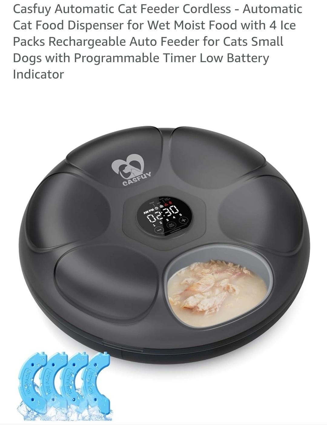 I'm selling a Casfuy Automatic Cat Food Dispenser. It's a cordless, rechargeable auto feeder with a stainless steel tray, perfect for wet or moist food. It also comes with 4 ice packs. It's designed for cats and small dogs and includes a programmable timer and low battery indicator. The dispenser features multiple slots for different food types, including fresh food, freeze-dried food, biscuits, canned food, dry food, and snacks. Each slot holds 200ml.