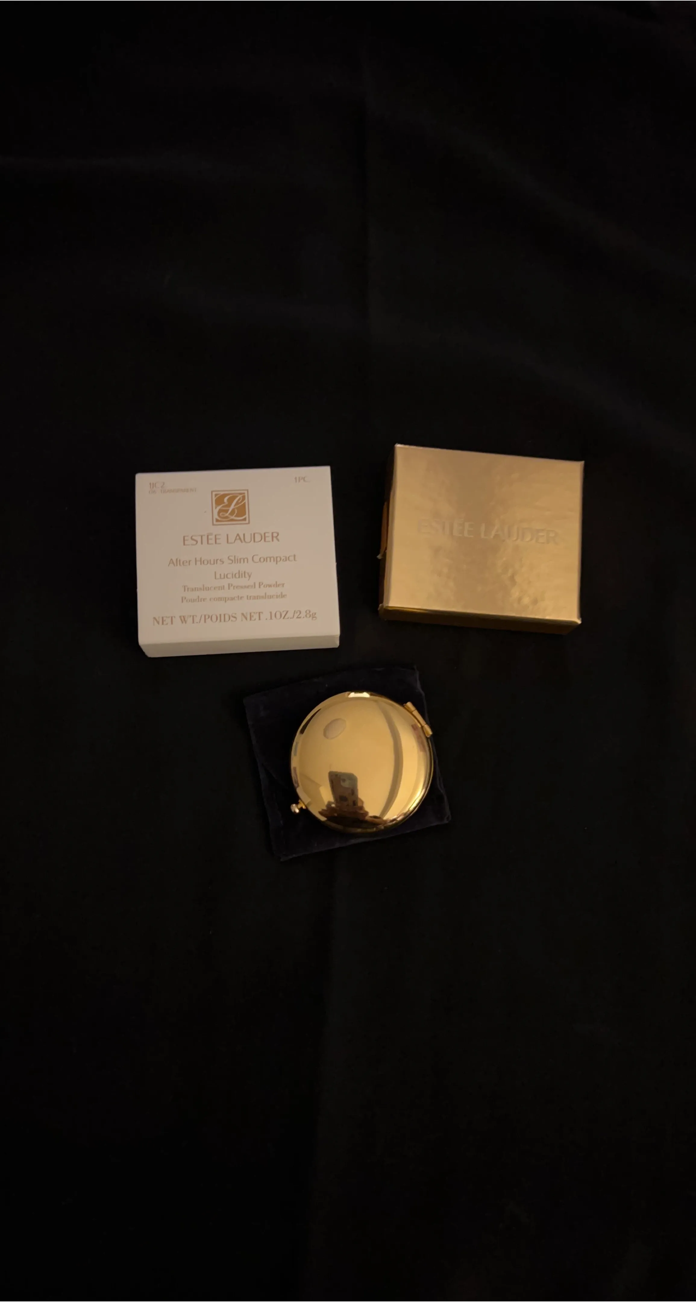 Selling a Vintage Estee Lauder After Hours Slim Compact with Lucidity translucent pressed powder. It's in great condition and comes with the original box and velvet pouch. The compact contains 0.1 oz / 2.8g of product. Perfect for on-the-go touch-ups. 2 inches in diameter.
