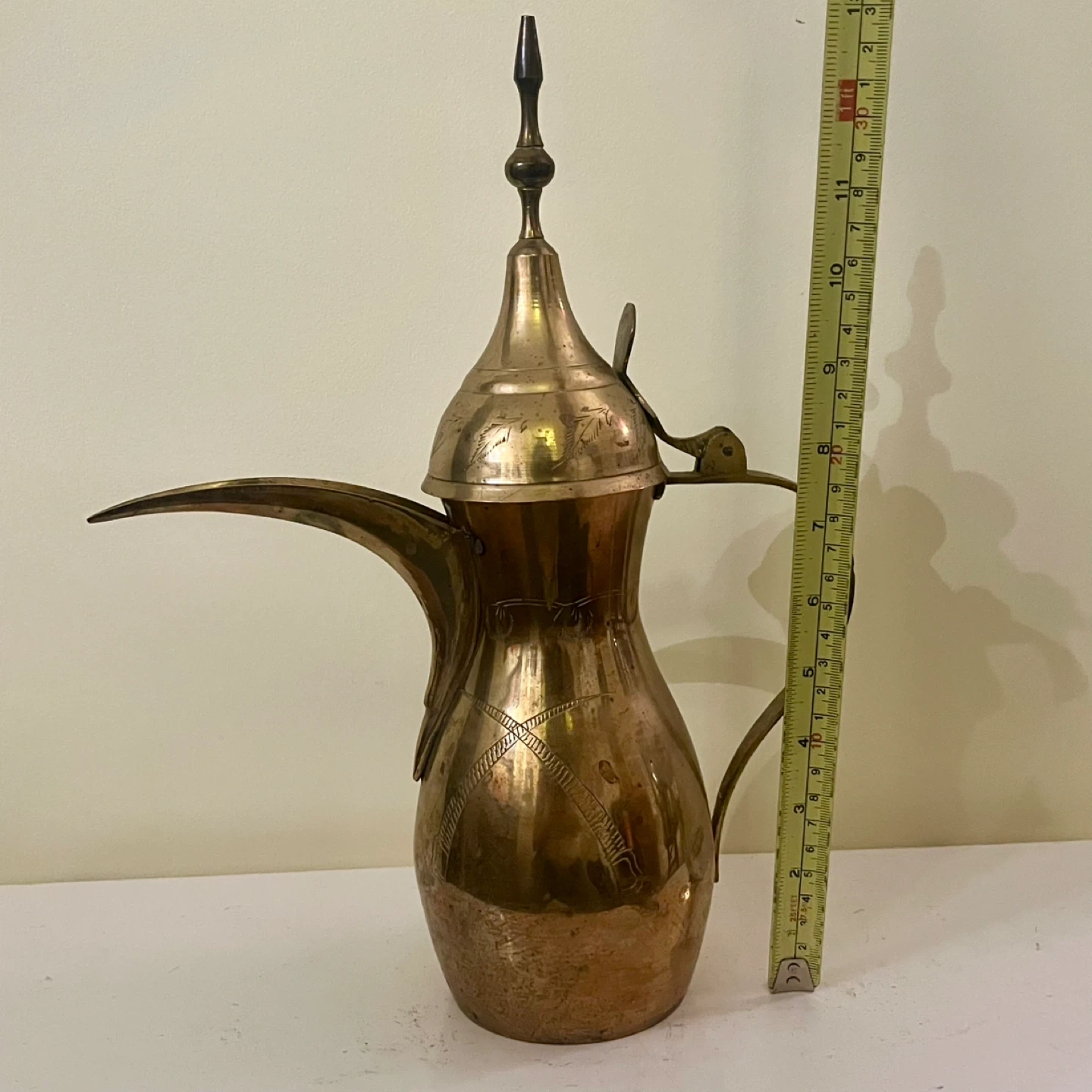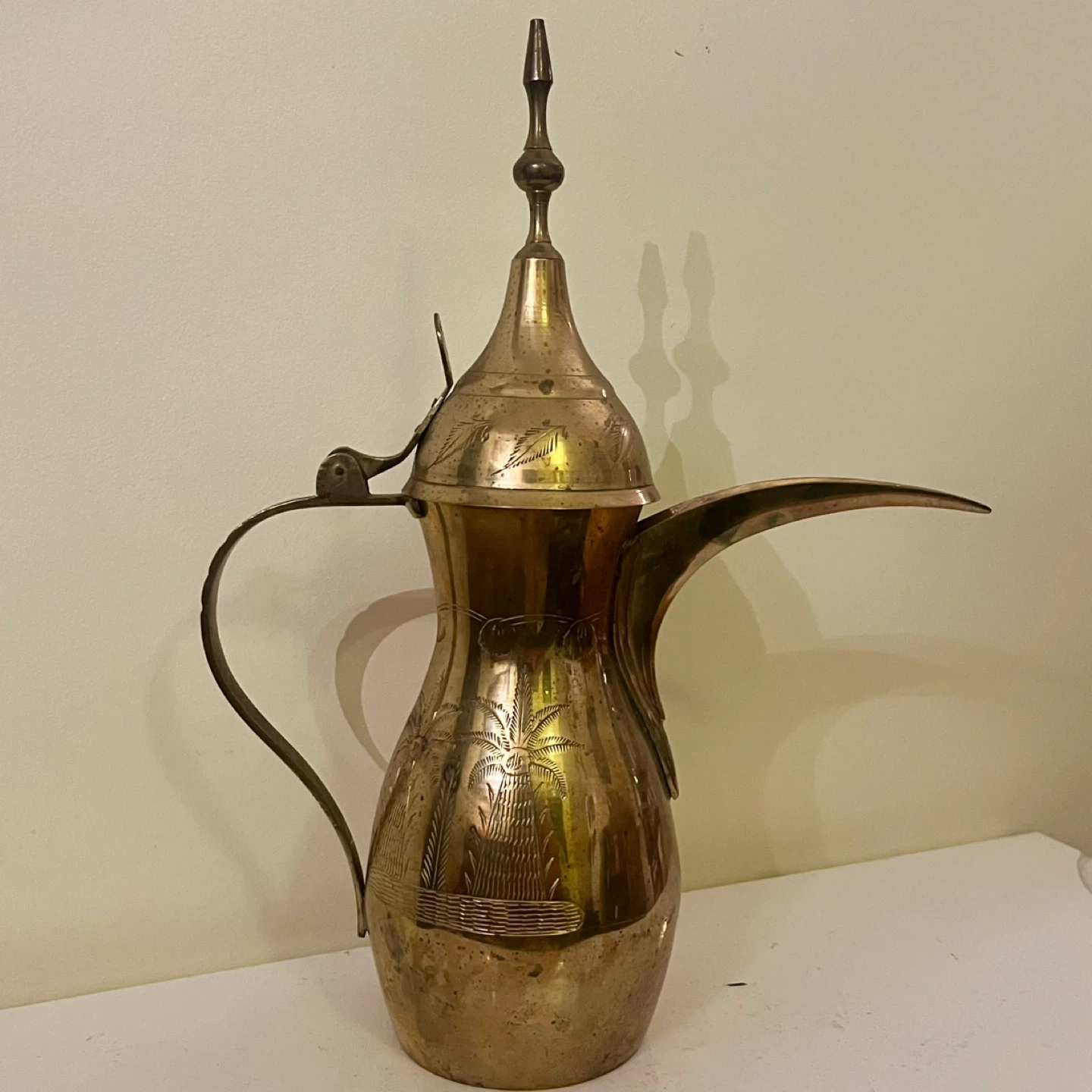 Vintage brass dallah with etched palm trees, in good condition. Measures 14” tall.
