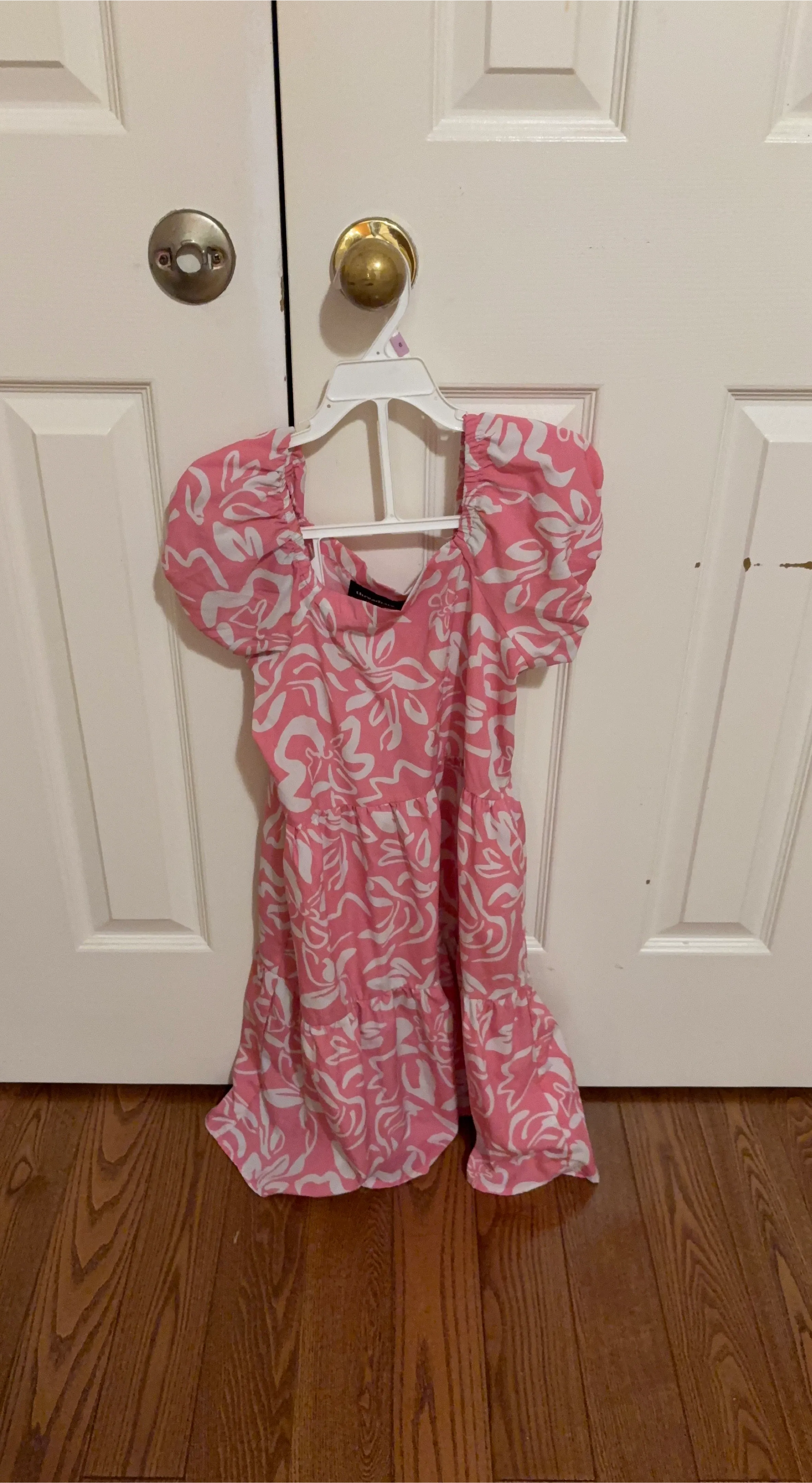 Selling a cute ThredUp dress! It's pink with a white floral pattern and has short, puffy sleeves. Perfect for a summer day!