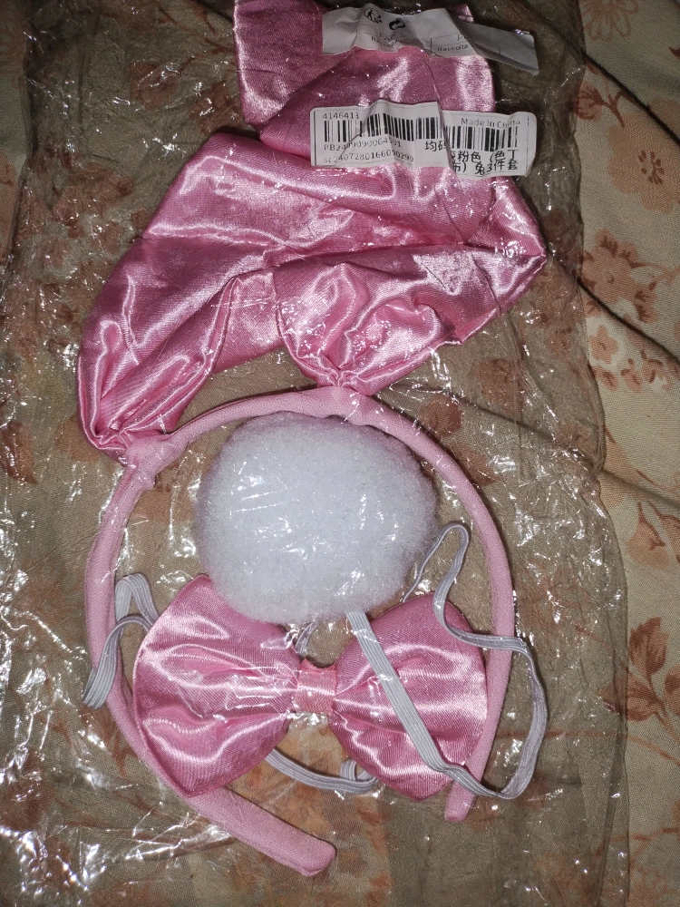 Brand new pink bunny costume set, still in the packaging! It includes a pink headband with bunny ears, a pink bowtie and a fuzzy white cottontail. Perfect for a costume party, Halloween costume or just for fun!