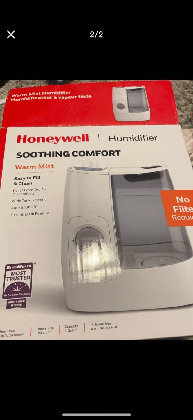 Selling a Honeywell Soothing Comfort warm mist humidifier. It's easy to fill and clean, providing relief from dry air discomfort. It features a wide tank opening, auto shut off, and an essential oil feature. This model is a multi-year BrandSpark Most Trusted winner by Canadian shoppers. It has a 1-gallon capacity and is suitable for a medium-sized room. It can run for up to 24 hours. *11.5” X 10” X 5.5” (29.2 X 25.4 X 13.9 cm) *filter-free *built-in inhalant/essential oil cup for added comfort *1-Gallon (3.79-Litre) tank capacity