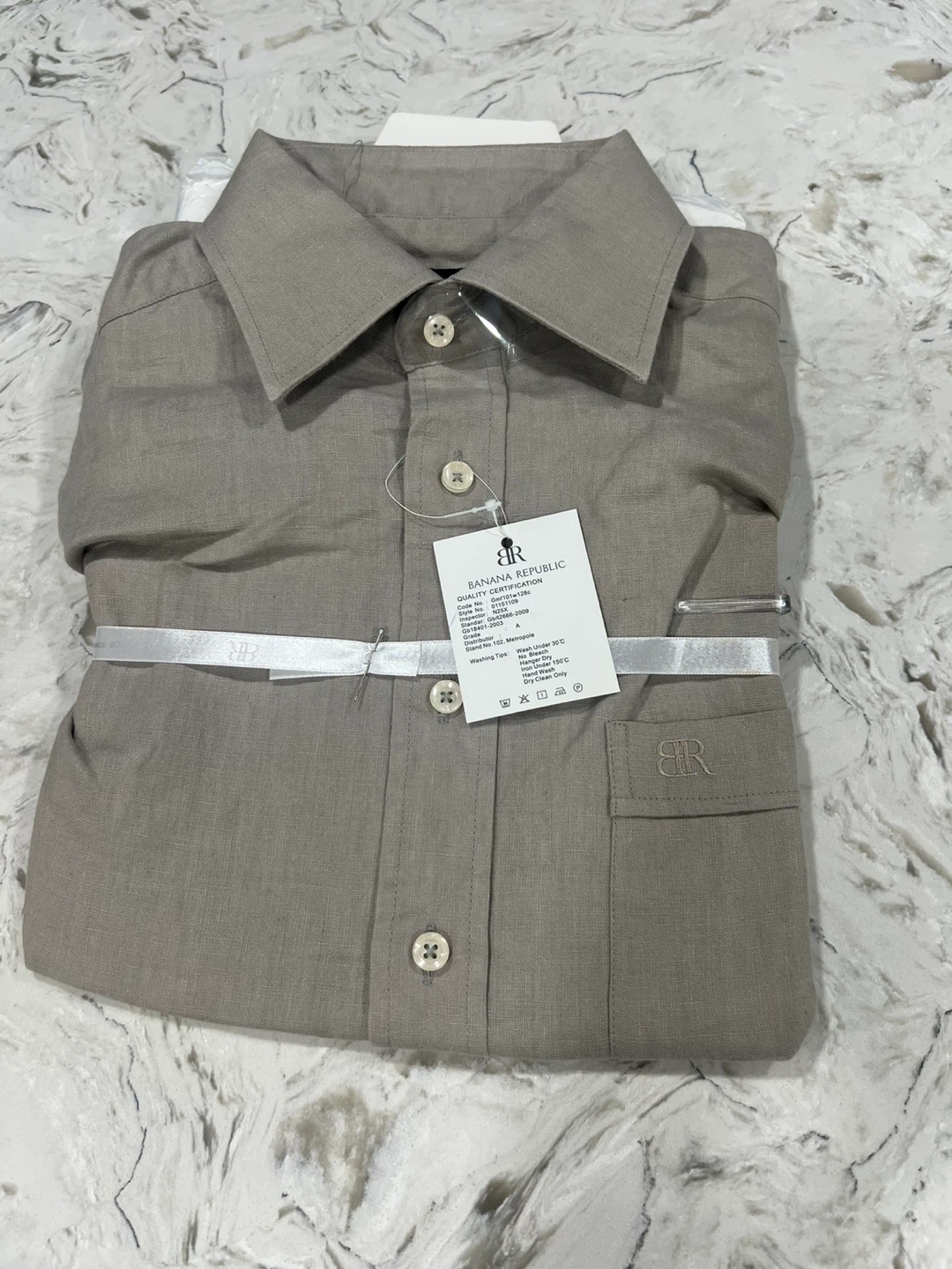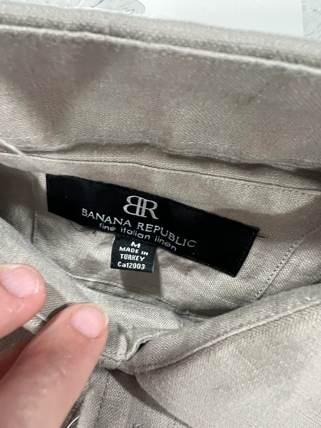 This is a Banana Republic fine Italian linen shirt in size medium. It's a beautiful neutral colour and made in Turkey. The shirt is in excellent condition and ready for a new home!