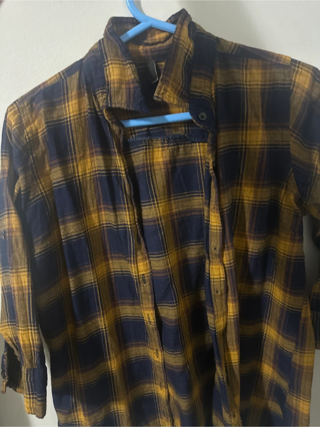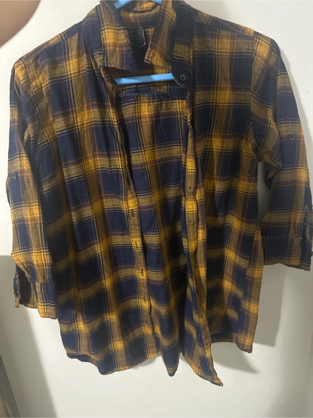 Selling a stylish flannel shirt with a classic plaid pattern in yellow and navy blue. It's in great condition and perfect for layering or wearing on its own. The material is soft and comfortable, making it ideal for everyday wear! Feel free to ask any questions