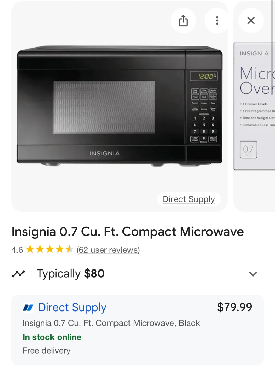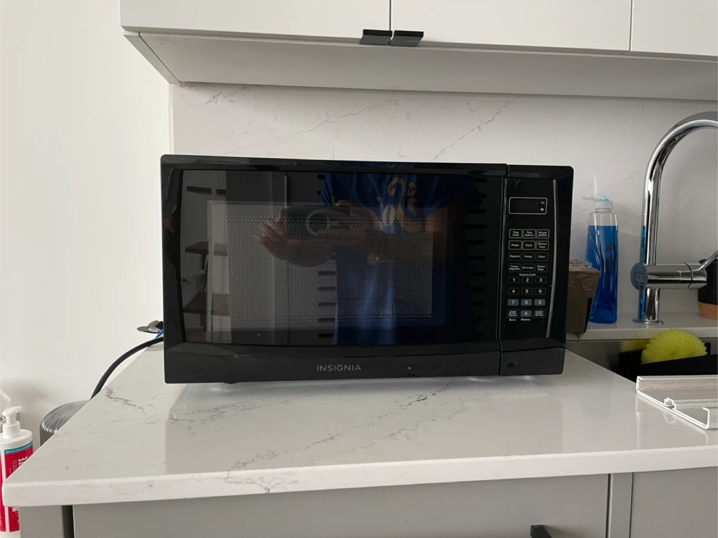 Selling an Insignia compact microwave in black. It's a great size for smaller spaces. The capacity is 0.7 cu ft. Originally bought for $80. Only used for a year.