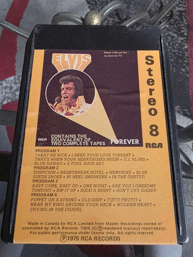 Relive the magic of the King with this vintage Elvis Presley Stereo 8 tape! This blast from the past contains the equivalent of two complete tapes and features classics like "Heartbreak Hotel" and "Blue Hawaii." This item is used, adding to its vintage charm. It's ready to bring some retro vibes to your listening experience. This 8-track tape includes: * Program 1: Treat Me Nice, I Need Your Love Tonight, That's When Your Heartaches Begin, G.I. Blues, Blue Hawaii, A Fool Such As I * Program 2: Suspicion, Heartbreak Hotel, Memories, Blue Suede Shoes, Hi Heel Sneakers, In the Ghetto * Program 3: Easy Come, Easy Go, One Night, Are You Lonesome Tonight, Rip It Up, Such a Night, Don't Cry Daddy * Program 4: Puppet on a String, Old Shep, Tutti Frutti, Wear My Ring Around Your Neck, Wooden Heart, Crying In The Chapel If this ad is still up, the tape is still available, ready to transport you back to the era of jumpsuits and unforgettable tunes!