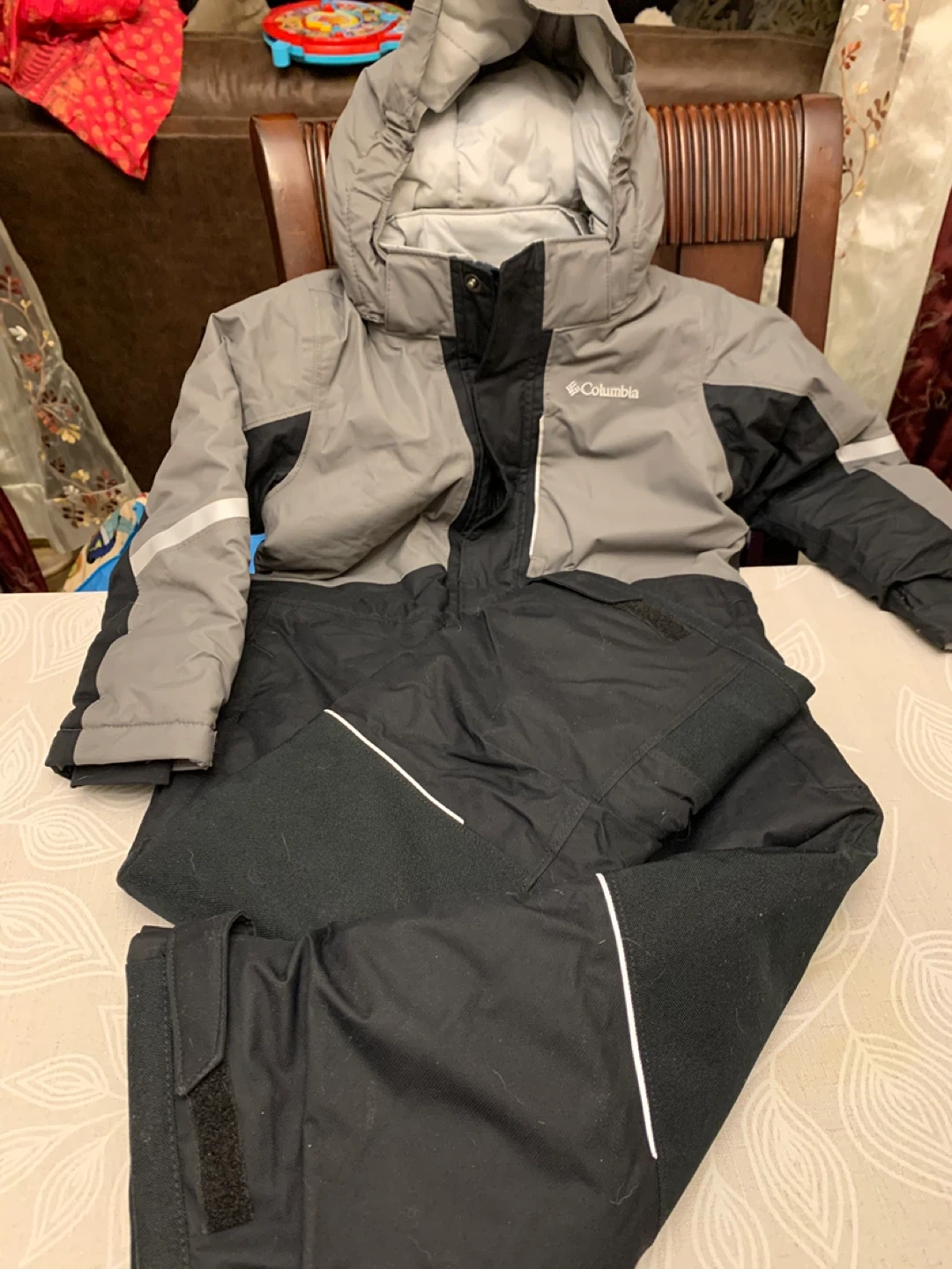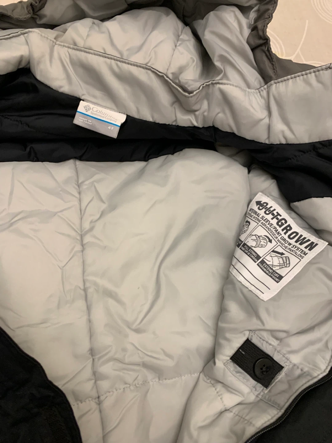 High-quality Columbia Sportswear snowsuit for toddlers, size 4T. ✨ Features: • Two-tone design (black & grey) with reflective details for safety • Insulated and water-resistant – perfect for snow play, skiing, or cold winter days • Attached hood for extra warmth • Durable reinforced knees and seat for active kids • Outgrown™ grow system – extends the life of the snowsuit as your child grows Size: 4T (toddler) Condition: Excellent, gently used – no major flaws Columbia is known for durable, premium-quality outdoor wear – this snowsuit will keep your little one warm, dry, and comfortable all winter. Cash pickup only.