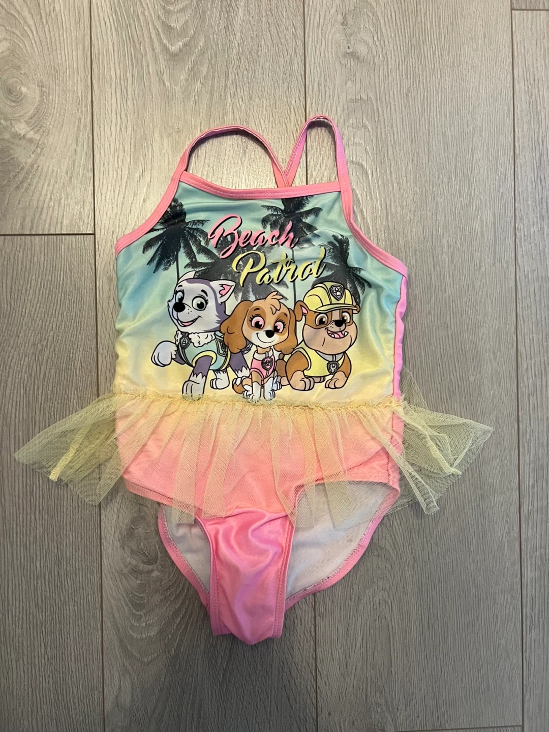 Super cute Nickelodeon Paw Patrol swimsuit for your little one! It's a size 4T and features a fun Beach Patrol design with Skye, Rubble, and Chase. Made with 85% polyester and 15% spandex for the body, and 100% polyester for the lining and mesh