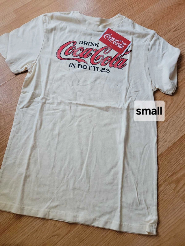 This is a brand new Coca-Cola graphic t-shirt in a size small, featuring the classic "Drink Coca-Cola in Bottles" design, perfect for adding a retro touch to your wardrobe! Additional specifications: * Size: Small * Design: "Drink Coca-Cola in Bottles" * Condition: New with tags This awesome tee is looking for a new home, maybe yours? Don't miss out! P.S. If the ad is up, it's still available!