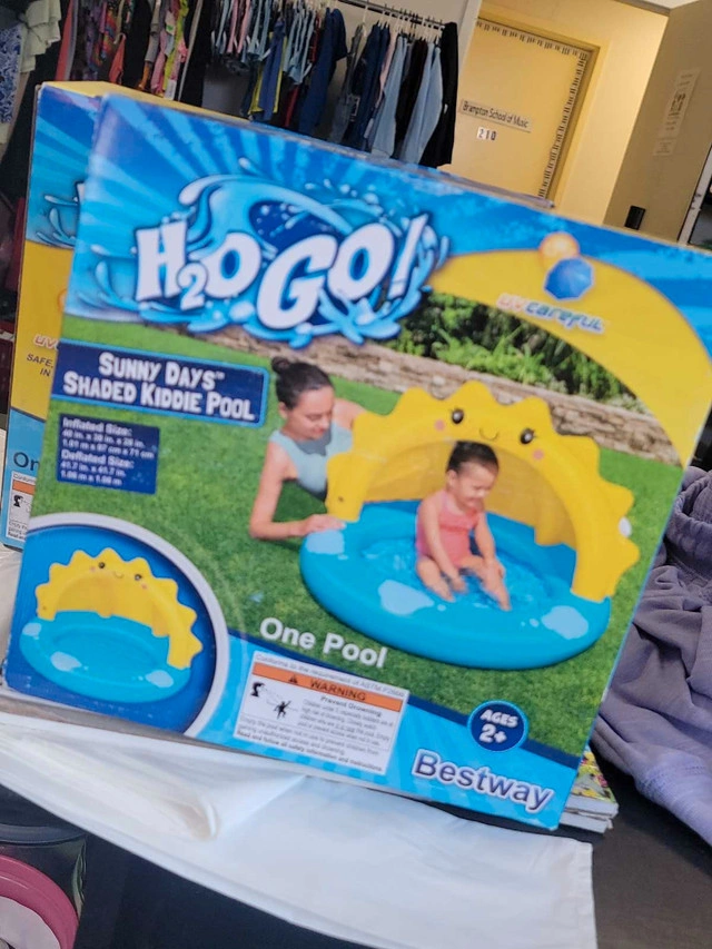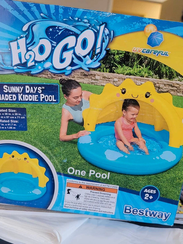 This is a new H2O Go! Sunny Days Shaded Kiddie Pool with UV Careful sun protection for ages 2+. It has never been opened and is still in its original packaging, ready to provide fun and safe water play for your little one. This compact pool is perfect for small backyards or patios, offering a refreshing escape from the summer heat with added sun protection. Specifications: * Brand: Bestway * Model: H2O Go! Sunny Days Shaded Kiddie Pool * Age Recommendation: 2+ * Features: UV Careful sun protection * Condition: New in box Since this pool is brand new and ready to make a splash, it’s available if the ad is up! Get ready for endless summer fun with this adorable shaded kiddie pool. Don't miss out on providing your toddler with a safe and enjoyable way to cool off during those hot summer days!