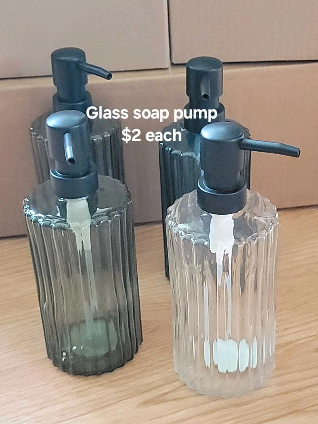 These brand new glass soap pumps each feature a sleek, modern design with a durable pump mechanism, perfect for adding a touch of elegance to any bathroom or kitchen. Looking to add a little sparkle to your sink-side routine? These soap pumps are just the ticket! And just so we're clear, if you're reading this, they're still up for grabs! - Material: Glass - Pump Material: Metal - Style: Modern - Colour: Clear, green or Smoke