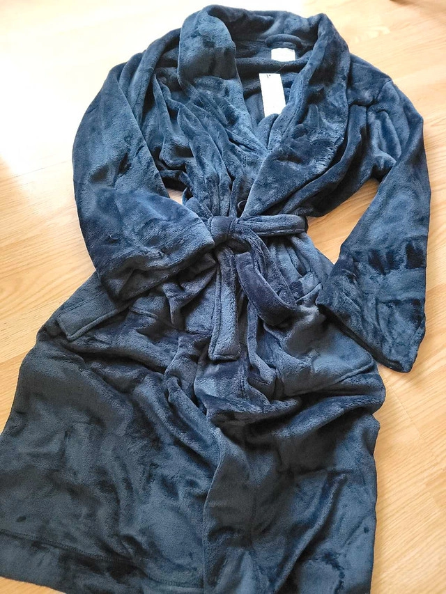 Snuggle up in this brand-new, plush navy blue robe, perfect for adding a touch of luxury to your loungewear collection. This cozy robe features a soft, absorbent material and a classic design, making it ideal for relaxing at home or after a shower.