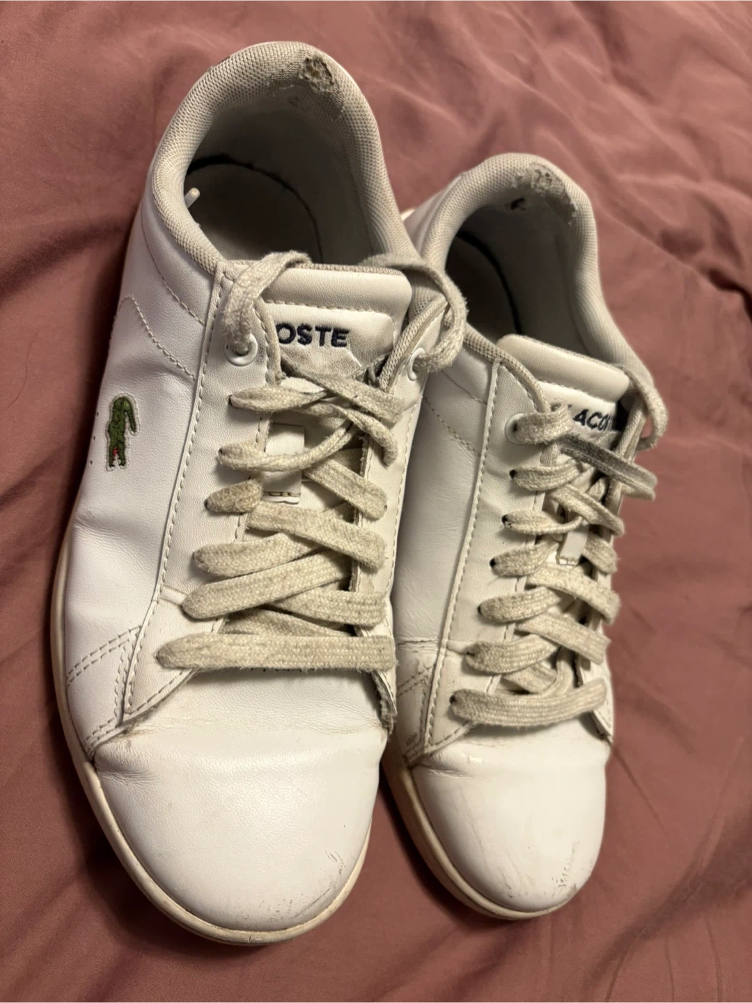 Selling a pair of Lacoste white leather sneakers. They have some wear and tear, as shown in the photos, with some scuffs and a small tear on the inside lining of one shoe. Still a stylish and comfortable pair of shoes!