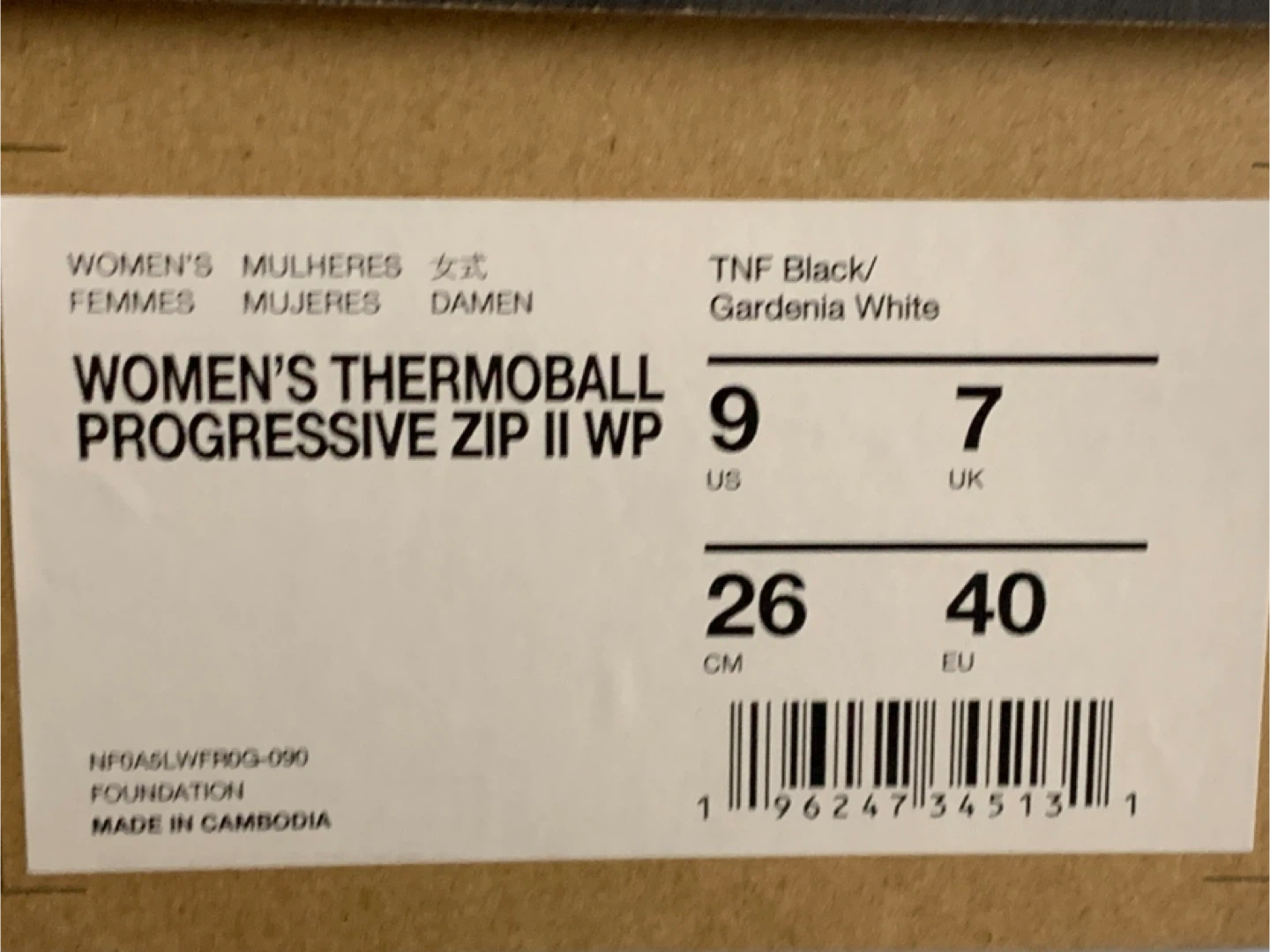 Stay warm, dry, and stylish this winter with these North Face ThermoBall Progressive Zip II waterproof boots. • Size: Women’s US 9 / UK 7 / EU 40 / 26 cm • Color: TNF Black / Gardenia White • Condition: Brand new in box (never worn) • Features: • Waterproof protection for wet and snowy conditions • ThermoBall Eco insulation for lightweight warmth • Easy front zip closure for convenience • Durable rubber outsole with excellent traction • Sleek black design with white sole for a modern look 💡 Perfect for winter walks, commuting, or outdoor adventures.