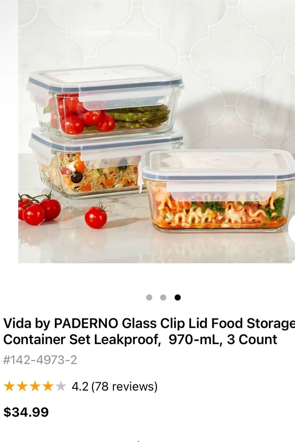 125Brand new Vida by Paderno Glass Clip Lid Food Storage Container Set. It's leakproof and includes 6 pieces. These are great for storing leftovers or packing lunches! Originally bought for $34.99 plus taxes ( $39.53) Outer packaging is not available but the boxes still wrapped up and new.
