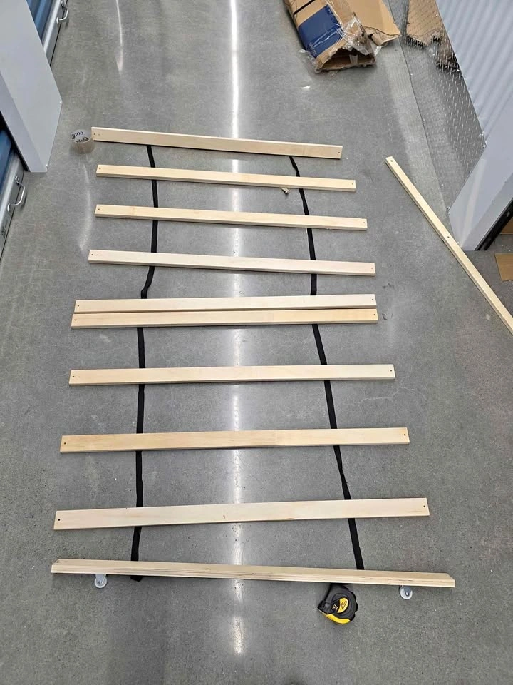 Set of 2 sturdy wooden bed slat frames, each measuring 35" long x 39" wide. Strong and durable, perfect for providing mattress support and extending the life of your bed. Easy to place on most standard frames, with connected straps to keep slats evenly spaced. Ideal as replacement slats or for DIY bed frame projects.