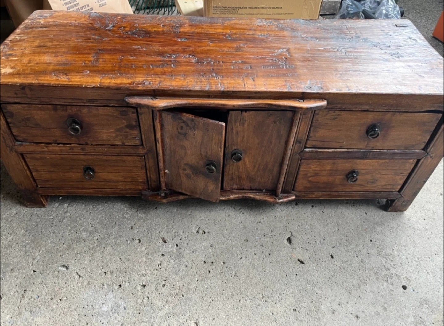 Antique Indonesian wooden cabinet great as a media stand. It has multiple drawers and doors for storage. Please note there is small damage to pin that holds door, as shown in the pictures, that could be fixed with some wood glue. 38x14x14