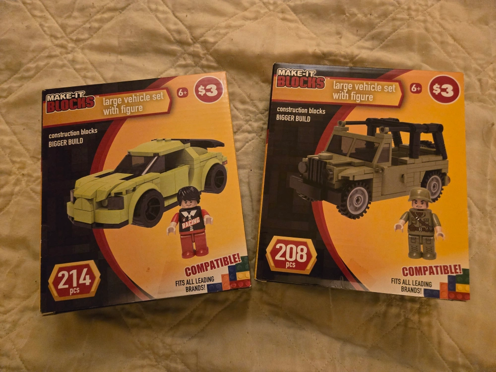 I have two MAKE-IT BLOCKS large vehicle sets with figures . Each set is designed for ages 6+. One set includes 214 pieces, and the other includes 208 pieces. They are compatible and fit all leading brands! offered free. pick up Saturday and Sunday in Astoria only