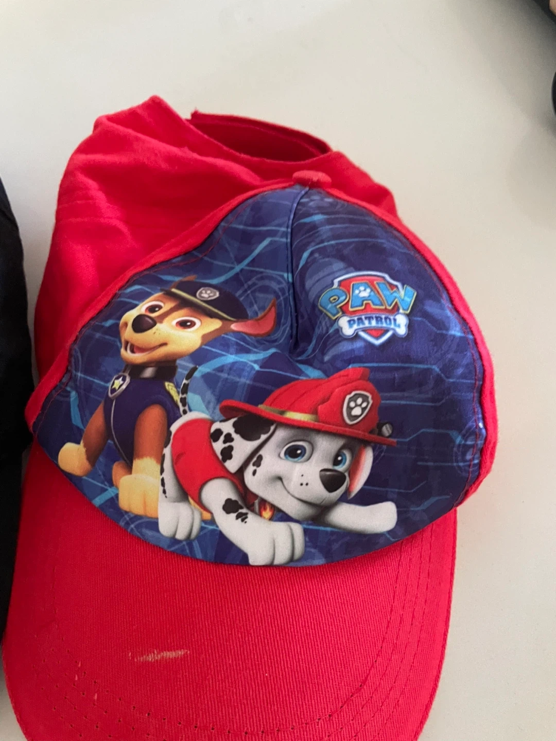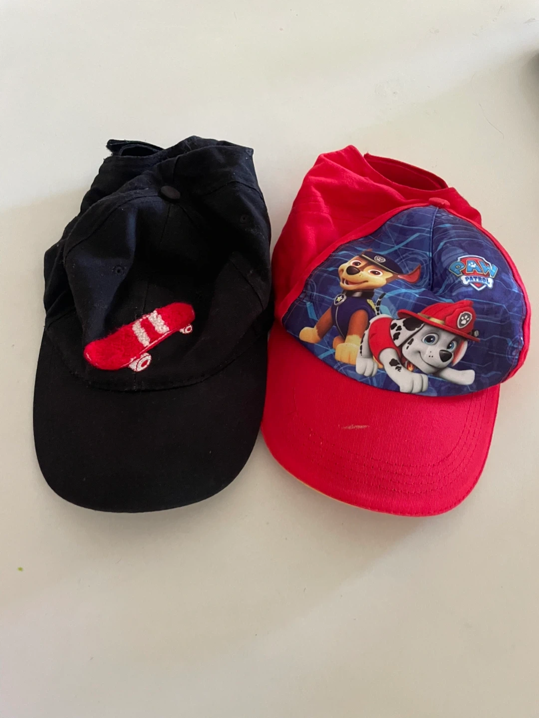 Two cute baseball caps for kids! One is red with a Paw Patrol design, and the other is black with a skateboard on it. They're in great shape and ready for a new home!
