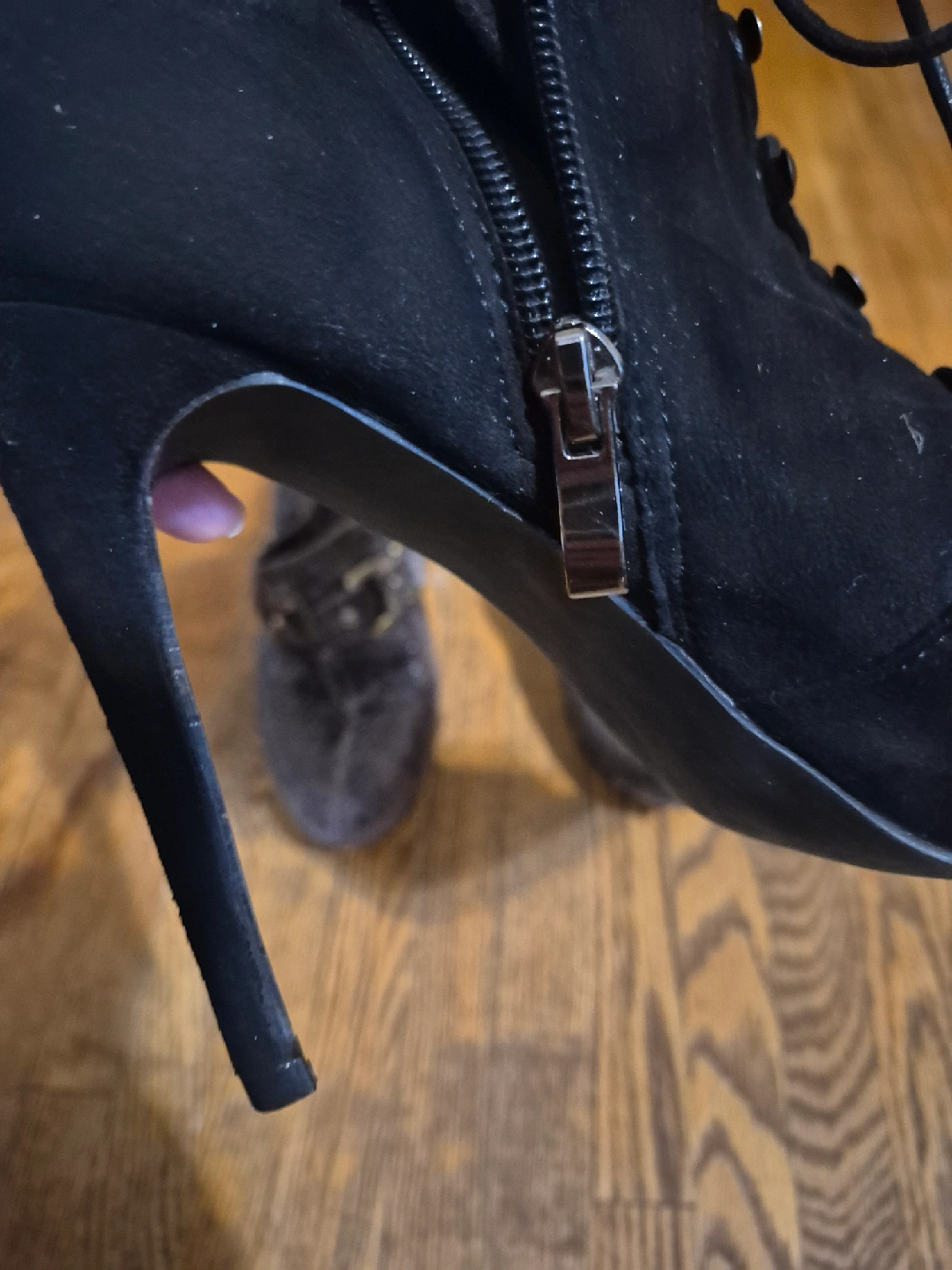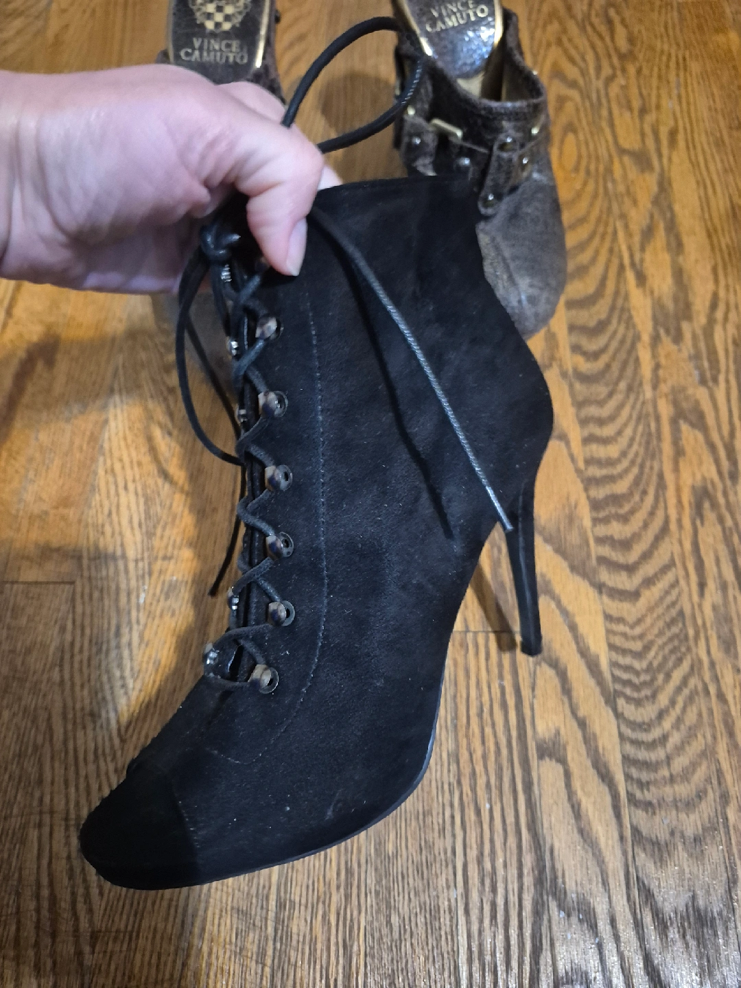 Selling a pair of Steve Madden black lace-up heeled booties. They're in great condition and ready for a new home! They feature a stylish lace-up design and a sleek heel.