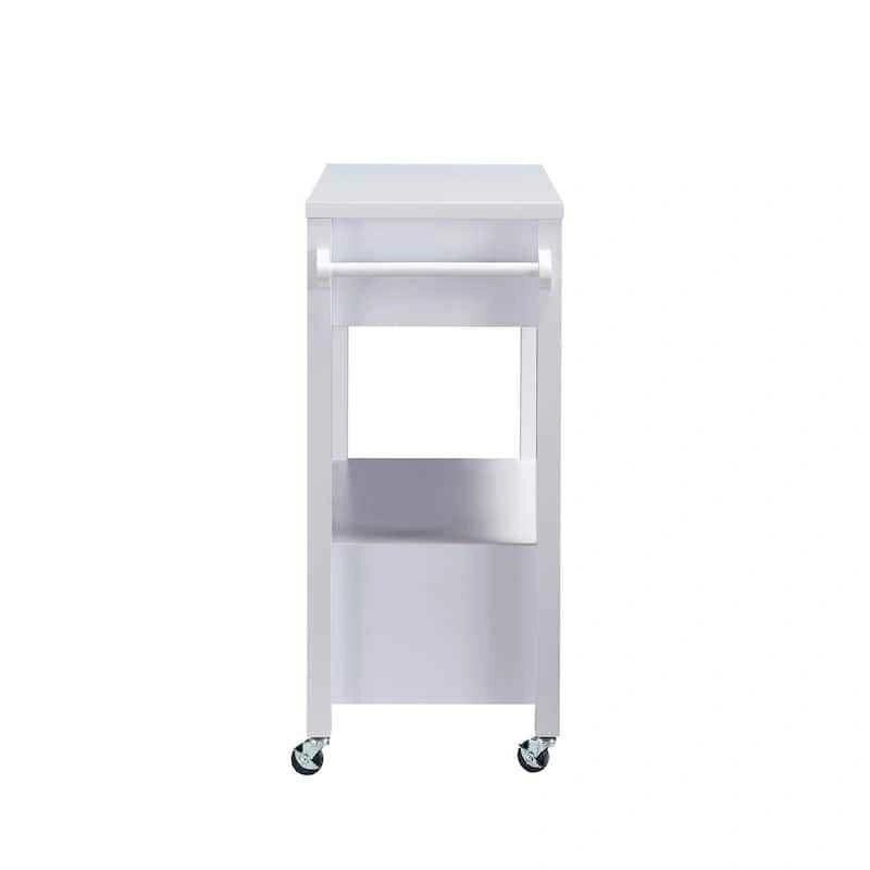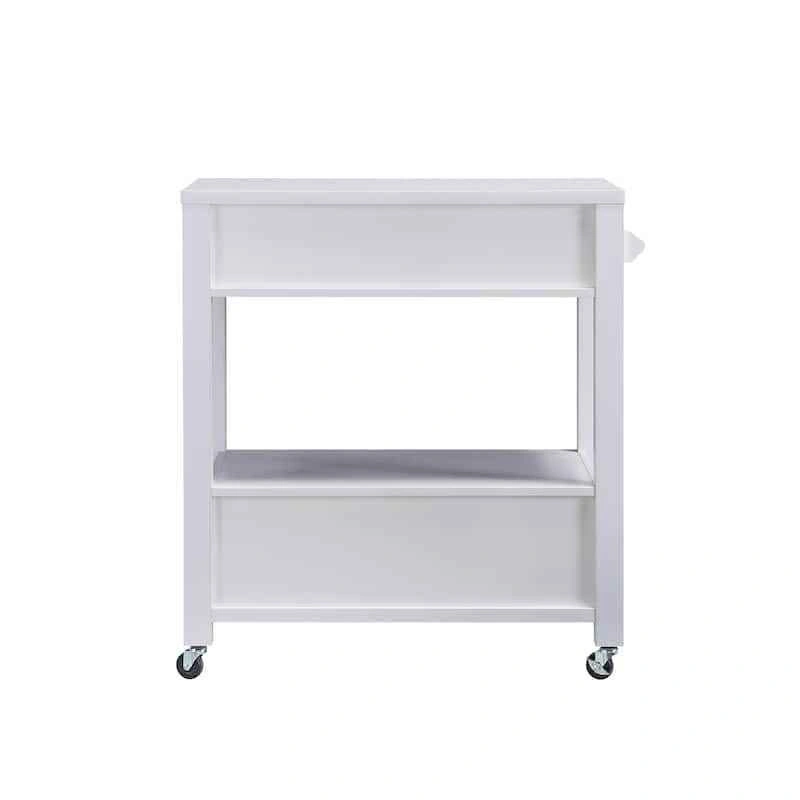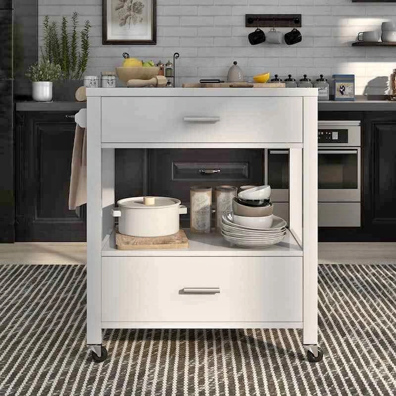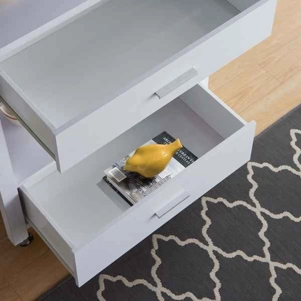 Brand new cart. It comes unassembled in original sealed box with all manufacturer parts and hardware for easy assembly. Also available in Cappuccino colour. Retails at Walmart for $410 + tax. Furniture of America Arton Contemporary Wood 2-Drawer Kitchen Bar Cart with Two Drawers in White Product details: A crisp silhouette lends classic charm to this contemporary cappuccino wood kitchen cart. A spacious surface and open shelf provide plenty of space for drinks and barware, while the two drawers offer concealed storage space like foil cutters, corkscrews, and bottle stoppers. This charming kitchen cart is complete with a towel rack and sits atop casters for easy mobility from room to room. Features: Includes: One (1) Kitchen Cart Style: Contemporary Finish: White Materials: MDF, Particle Board Open bottom shelf Built-in towel rack Four caster wheels Spacious surface Convenient two (2) drawers on metal glides Easy to follow step by step assembly guide included Specifications: Product Dimensions: 31.25"W x 15.5"D x 35"H Weight Capacity: 50 lbs. Product Weight: 52 lbs. Assembly Required: Yes