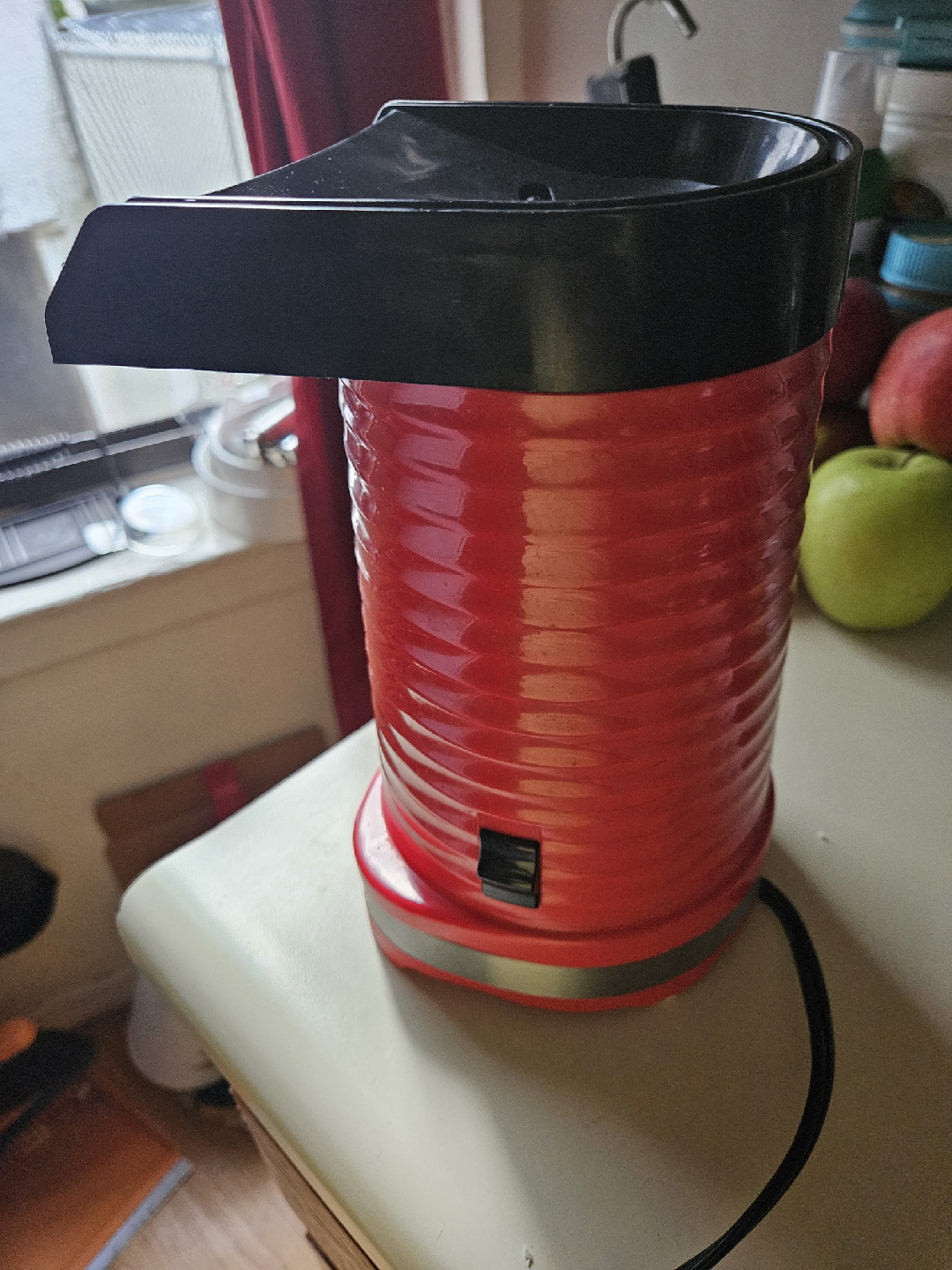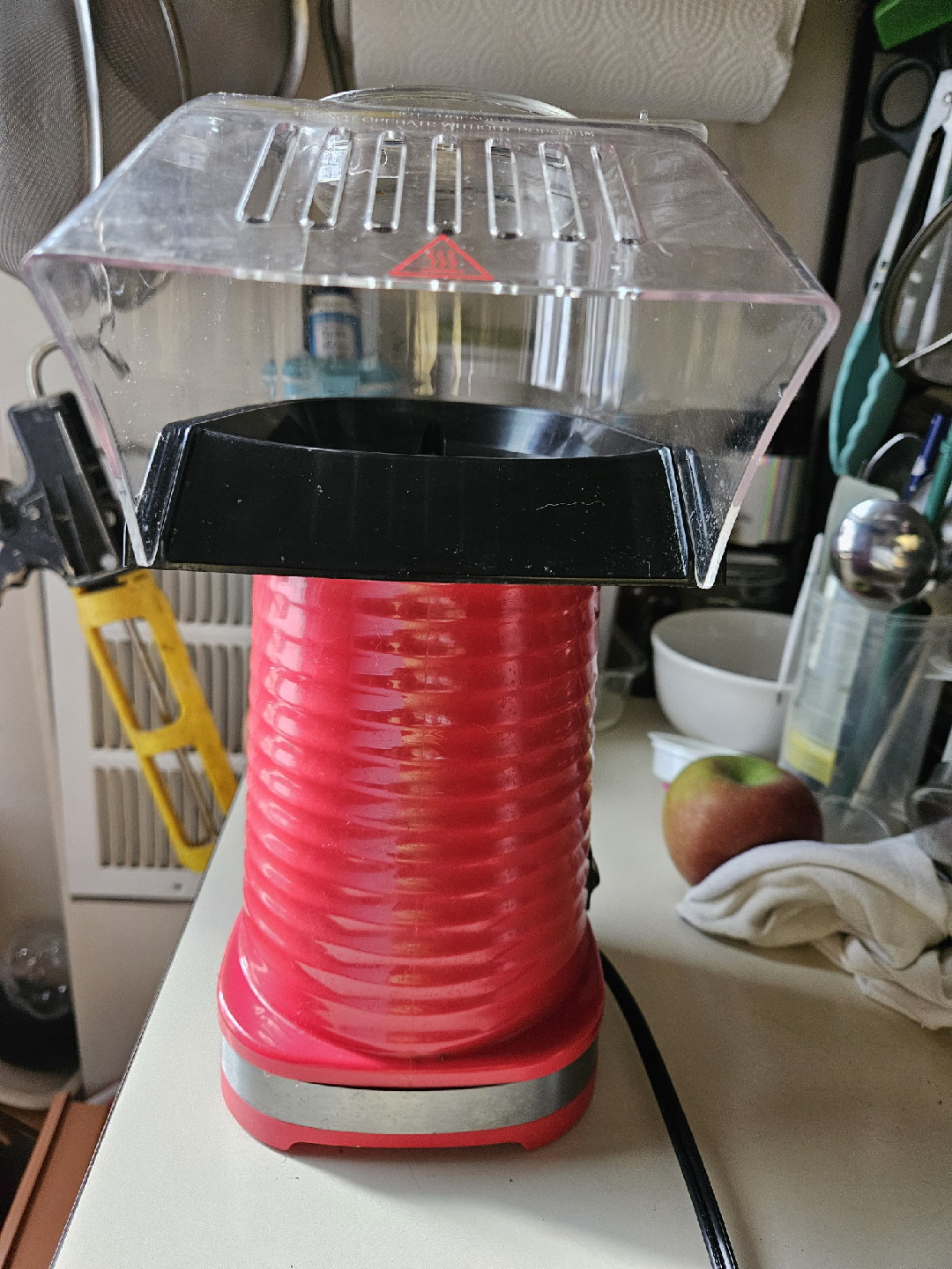 Hot Air Popcorn Machine, Popcorn Maker, 1200W Hot Air Popcorn Popper for Home, BPA-Free, No Oil Needed Healthy Family with Measuring Cup and Removable Cover (Red). It's in great condition and ready to make some delicious popcorn. This popper uses hot air, so no oil is needed, making it a healthier option for snack time