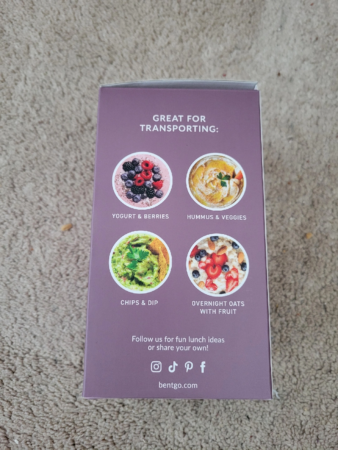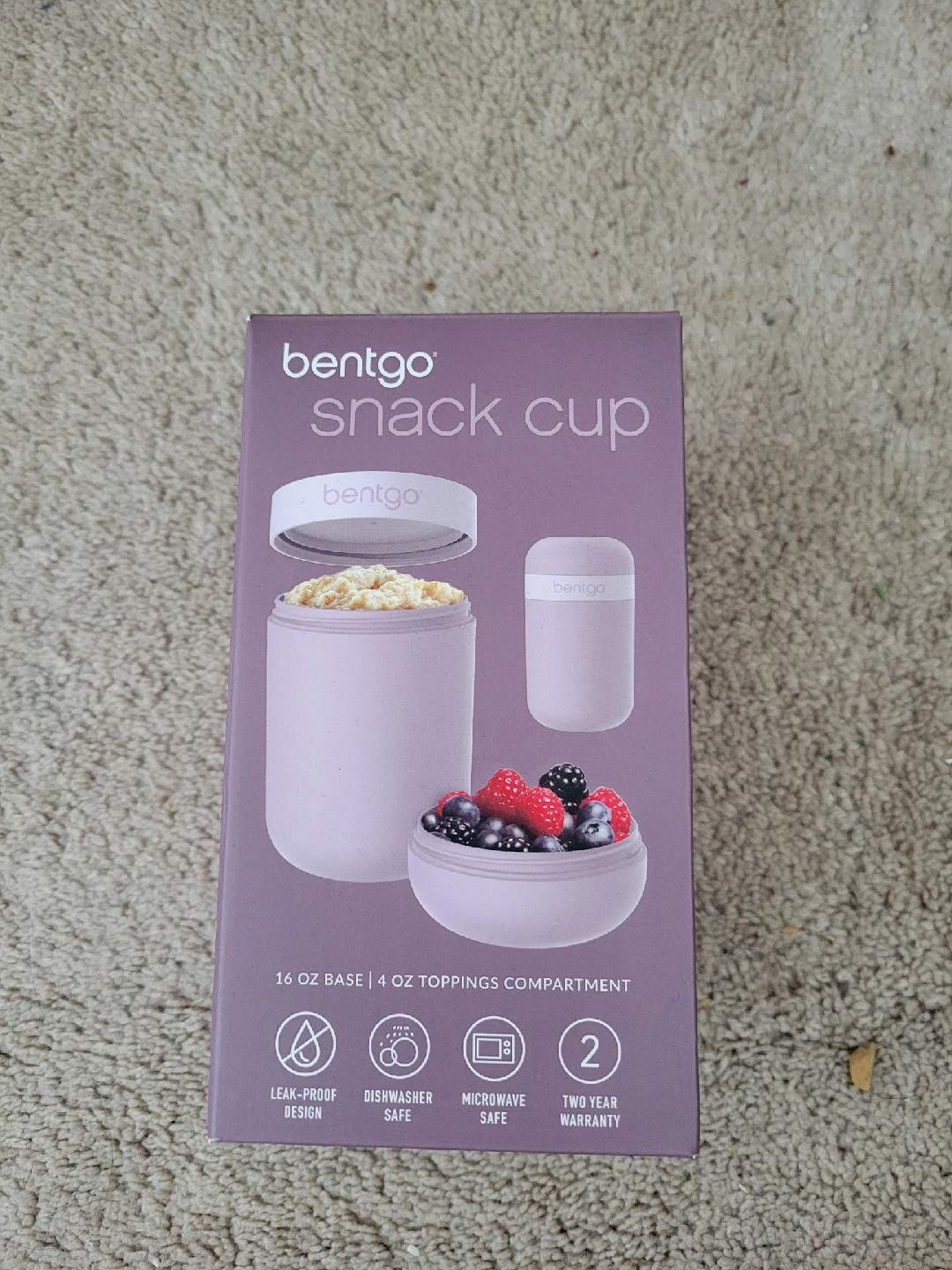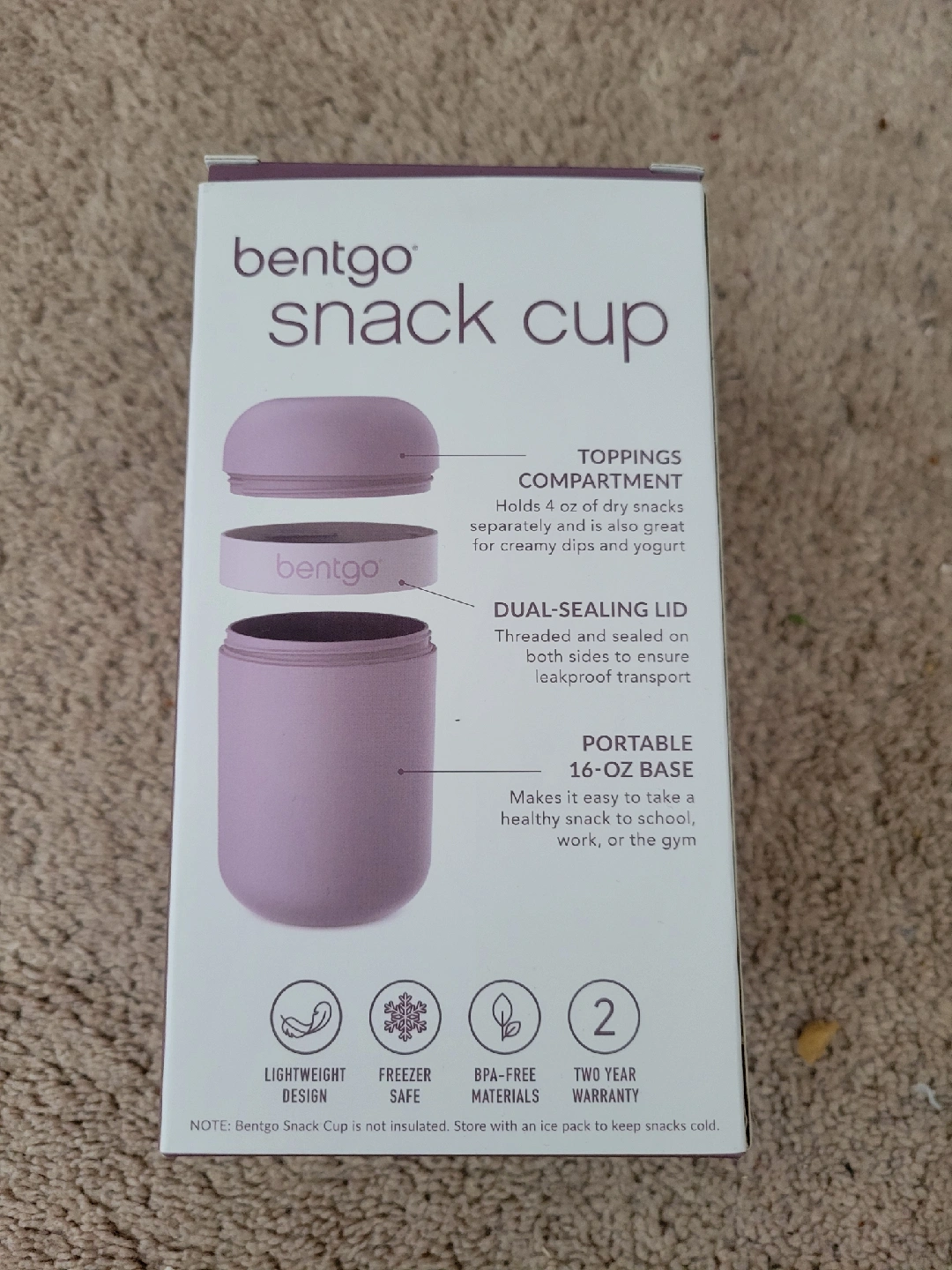 Bentgo snack cup in lilac. It's great for transporting yogurt & berries, hummus & veggies, chips & dip, and overnight oats with fruit.