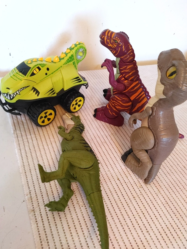 Selling a set of four dinosaur toys! There's a dinosaur car and three dinosaur figures no remote for the car (still cute) others may need batteries