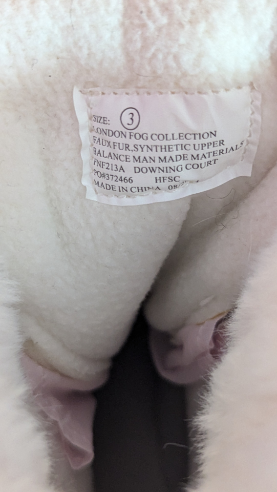 Cute London Fog winter boots for girls, size 3. They feature a faux fur lining and synthetic upper. The soles are man-made materials. Perfect for keeping little feet warm and stylish!