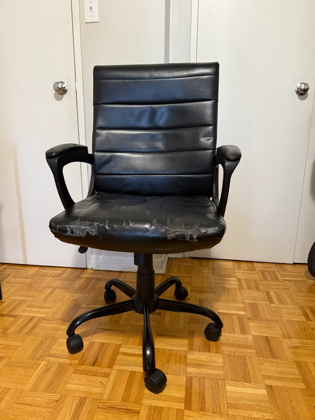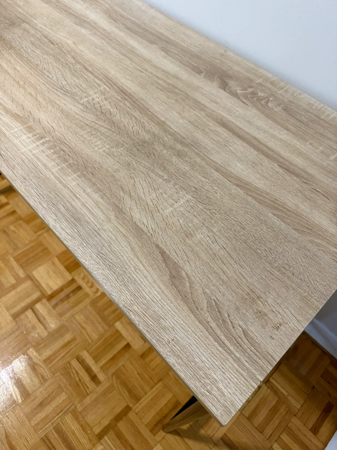 Selling an office desk with a light wood-grain top and black metal frame. Also included is a used black office chair. The chair shows some wear on the seat.