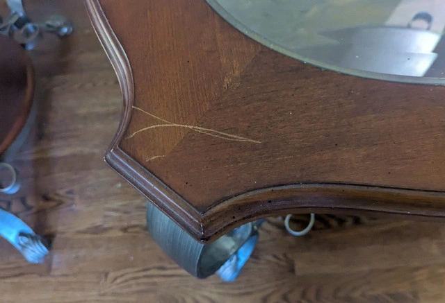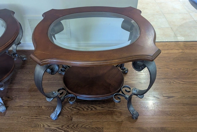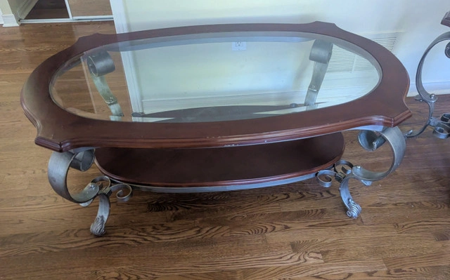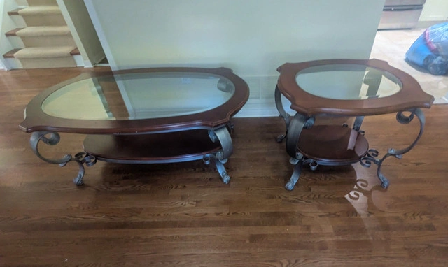 Both coffee table & end table are made of solid wood, metal and glass. They are very heavy and are very good quality tables. There is a scratch on the end table but otherwise both tables are in excellent condition. You get both tables for $80 and it is for pick up only. We are located at the Bayview and Hwy 7 area of Richmond Hill. The Dimensions for the Larger table is: L 48 x D 30 x H 20 The Dimensions for the Smaller table is: L 308 x D 24 x H 24 Condition: Used - Good