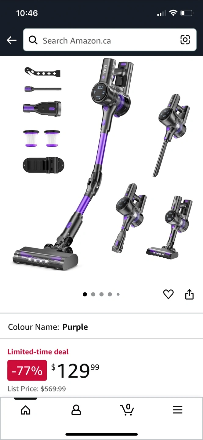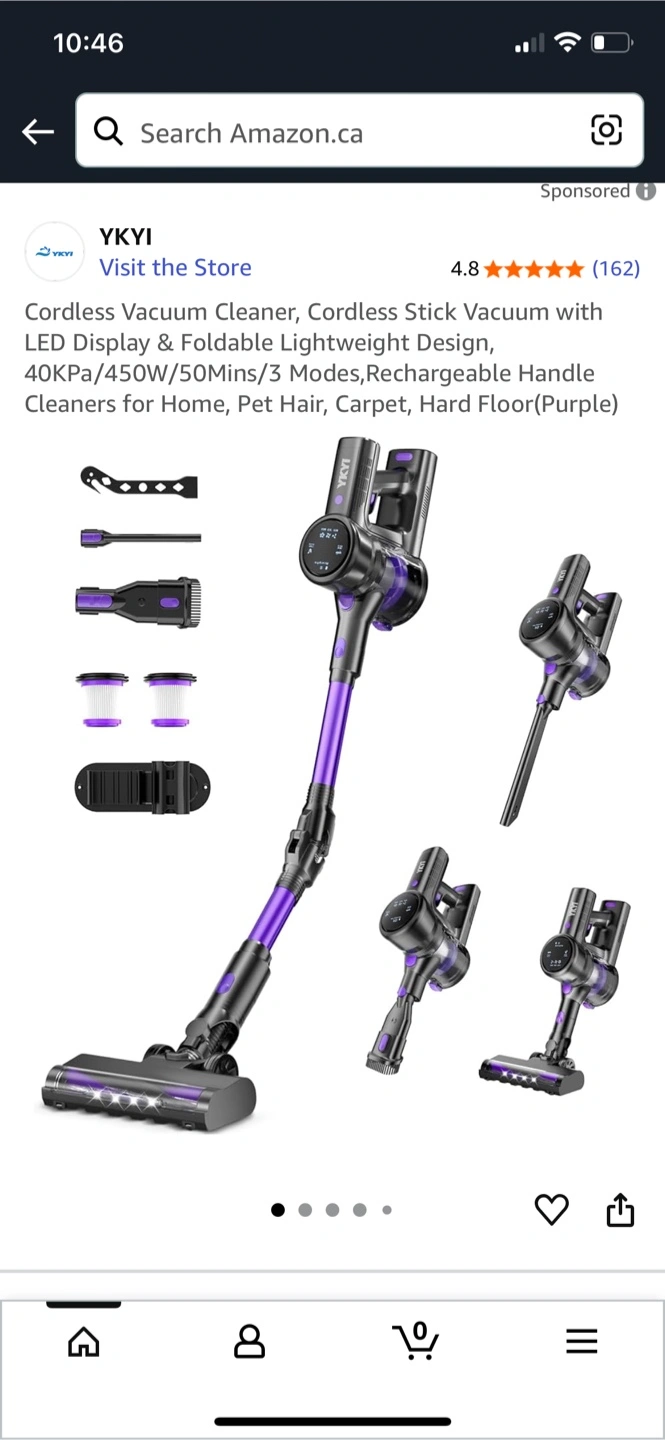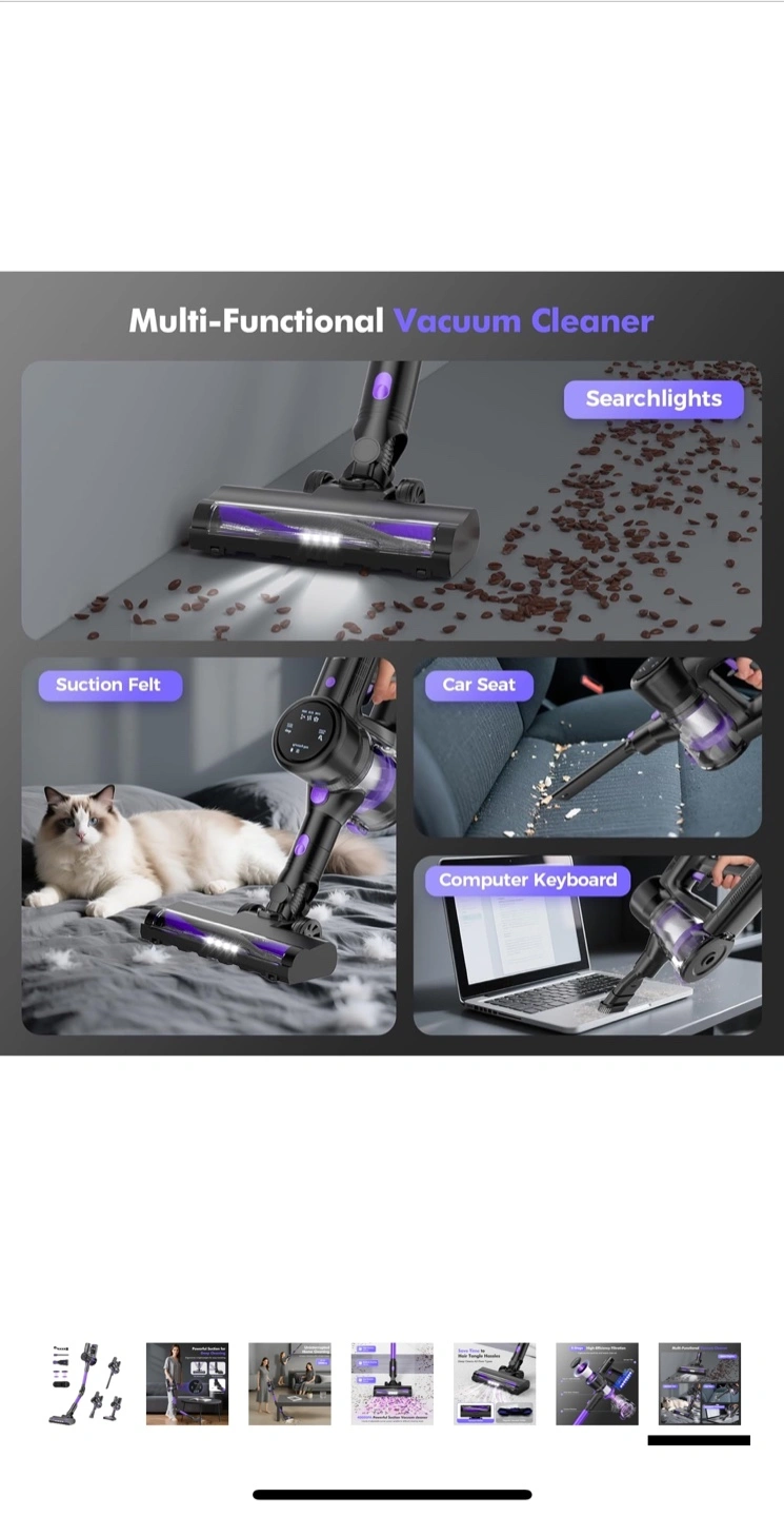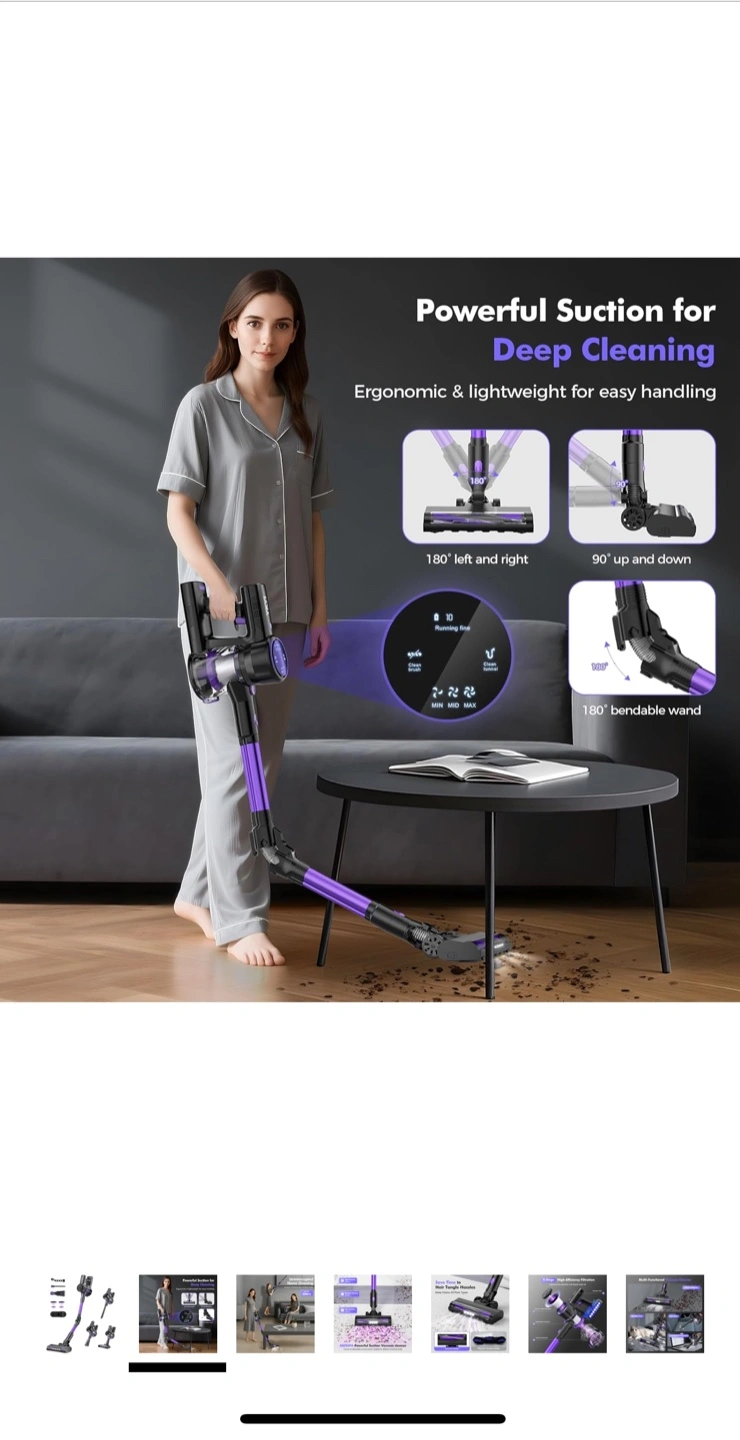 Looking to sell my YKYI cordless stick vacuum cleaner in purple! It's a lightweight design with a foldable handle. It has powerful 40000PA suction, 450W power, and can run for up to 50 minutes on a single charge. It also has 3 modes for different cleaning needs. Originally listed for $569.99!
