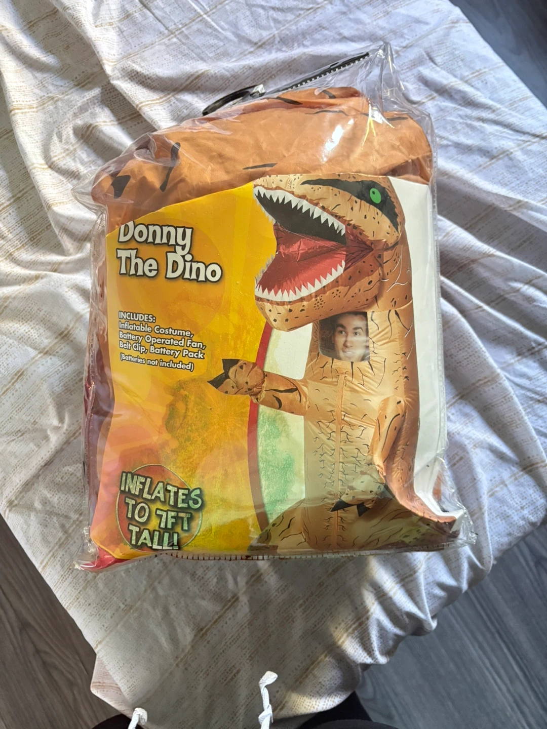 Selling a Donny The Dino inflatable costume! It includes the inflatable costume, a battery-operated fan, a belt clip, and a battery pack (batteries not included). This costume inflates to 7ft tall!