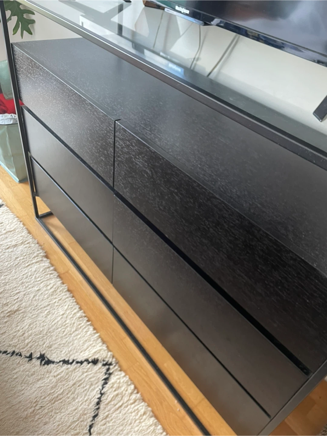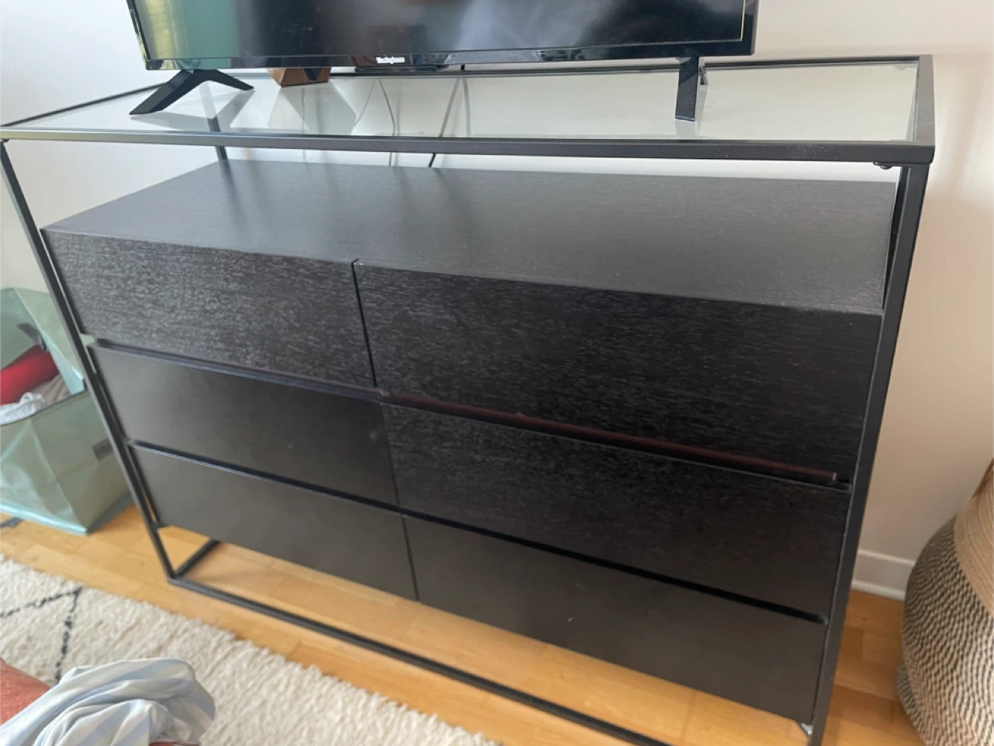 It has six drawers, and measures approximately 4ft wide, 18 inches deep, and 3ft tall.