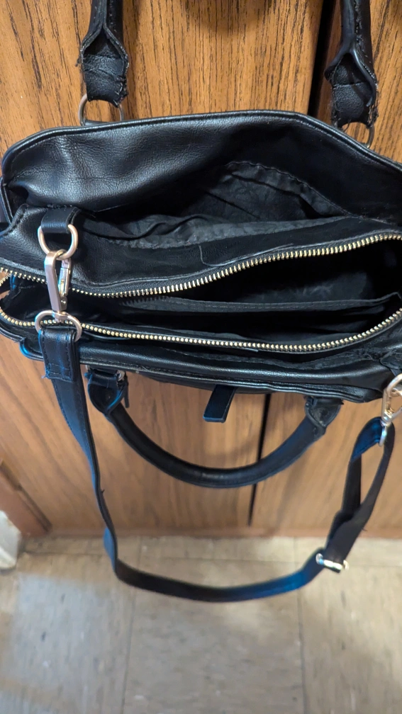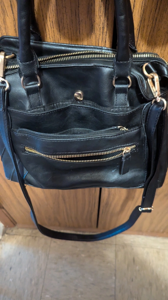 Selling a stylish black handbag! It features gold zippers and a convenient shoulder strap. It's in great condition and ready for a new owner