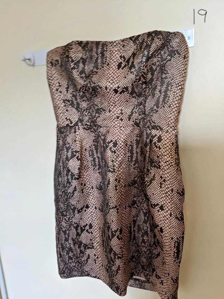 Light pink and black (with gold threading) snake print cocktail dress from M. Only worn once. In Medium. ($15)