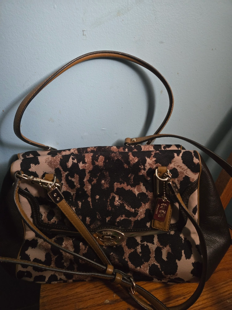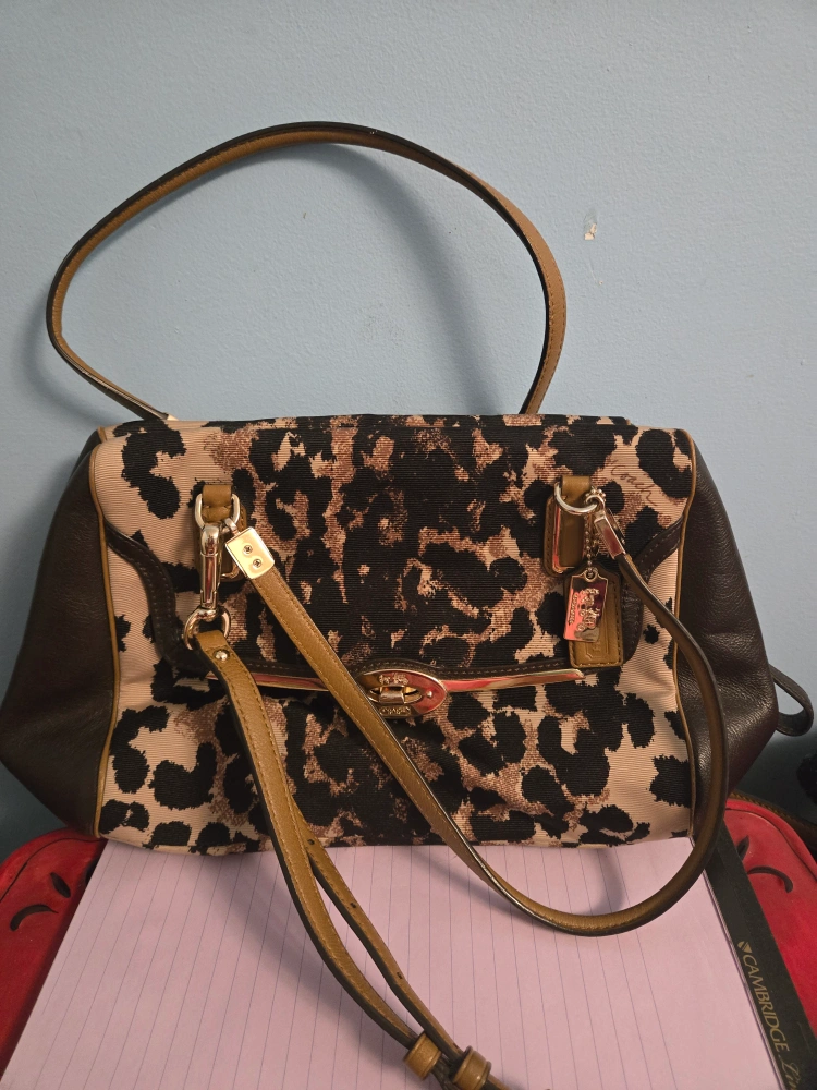 Selling a stylish Coach handbag with a unique leopard print design. It features both a handle and a longer strap for versatile carrying options. The bag is in great condition and ready for a new home!