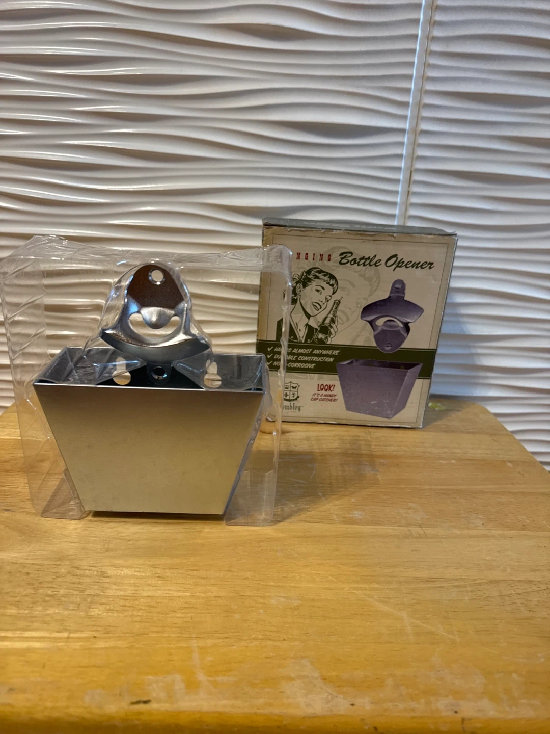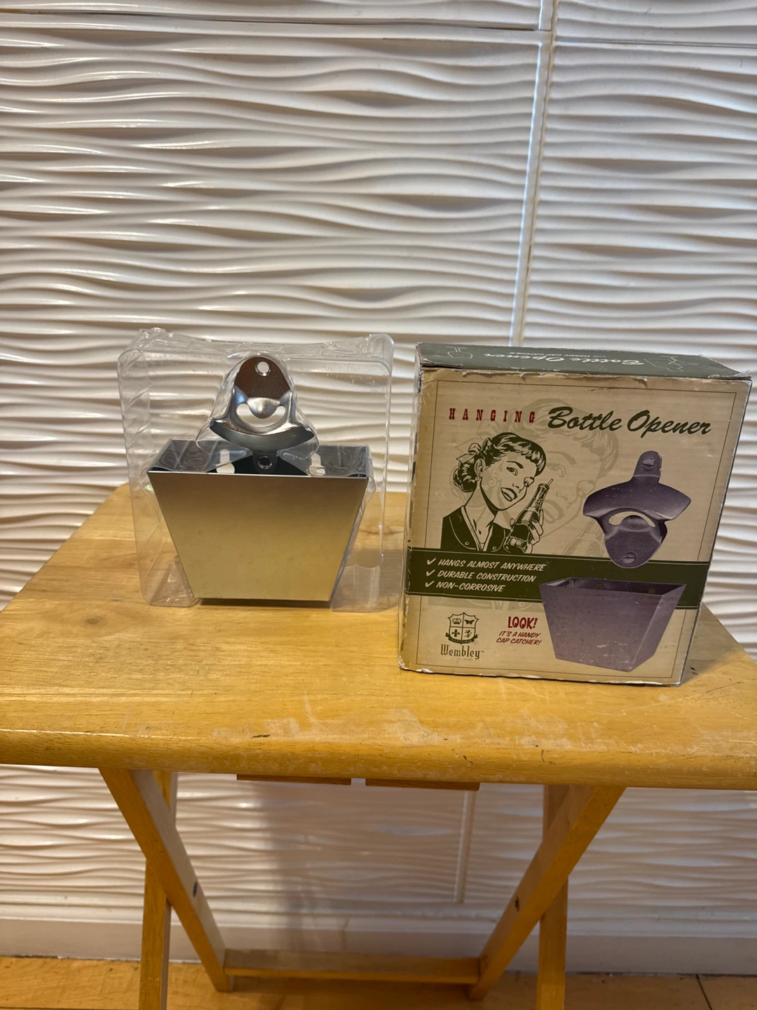 I'm selling a brand new Wembley Hanging Bottle Opener! It's still in its original packaging, so it would make a great gift for someone who enjoys a cold beverage. It's designed to hang almost anywhere and has durable construction.