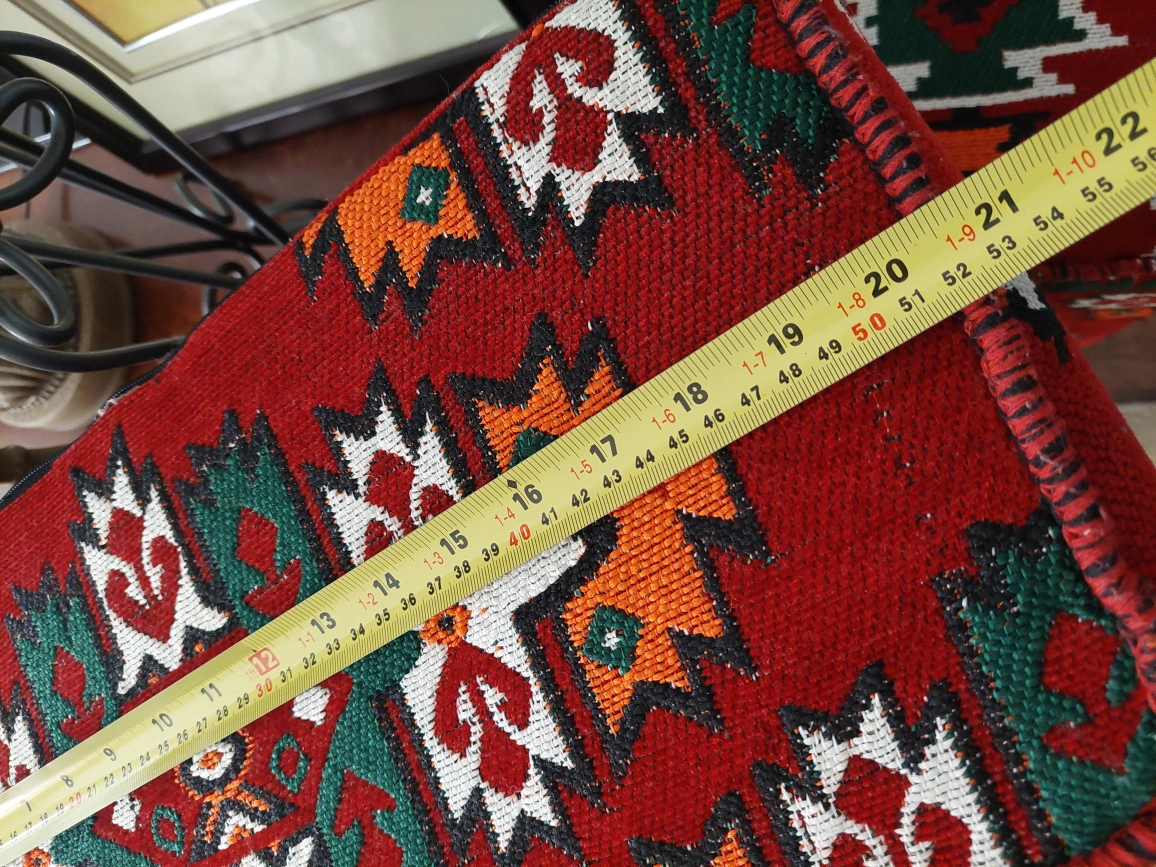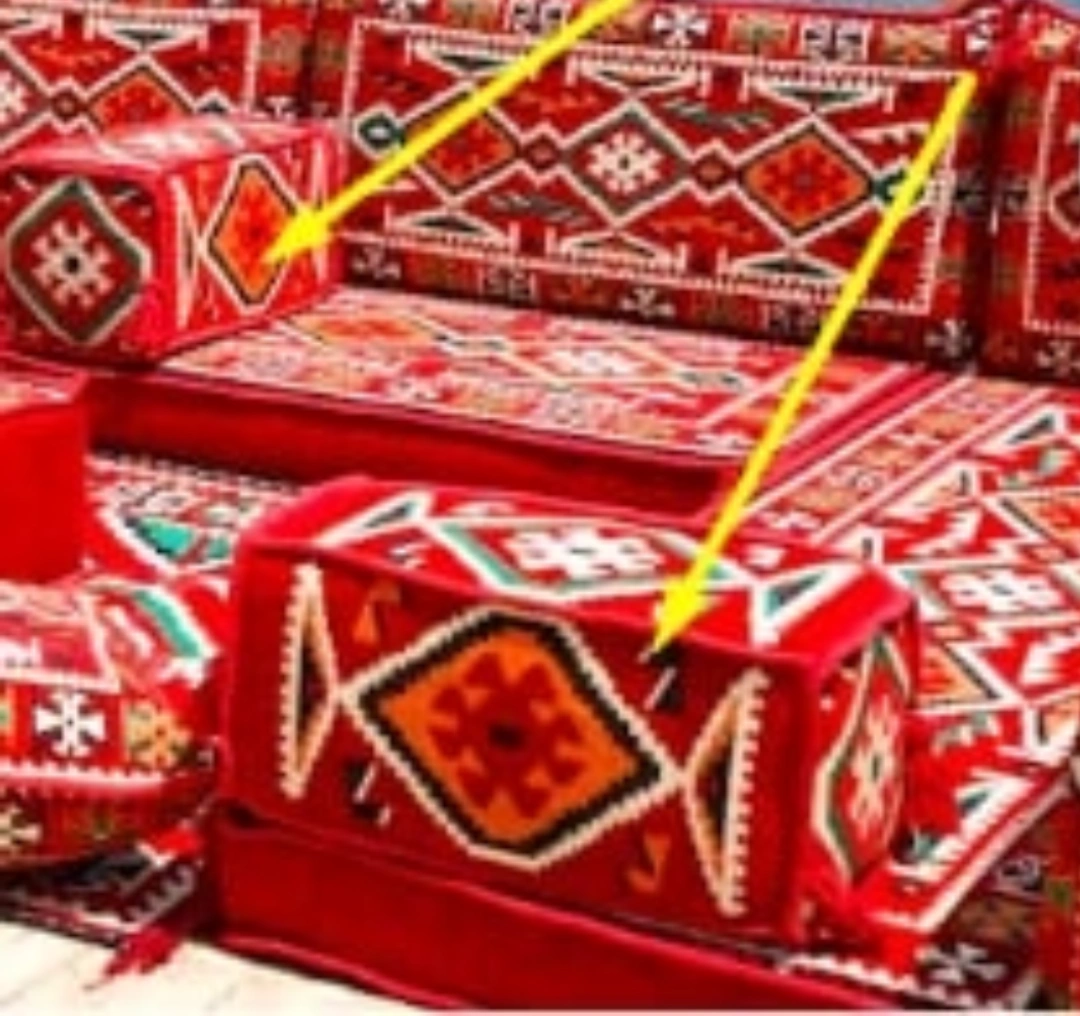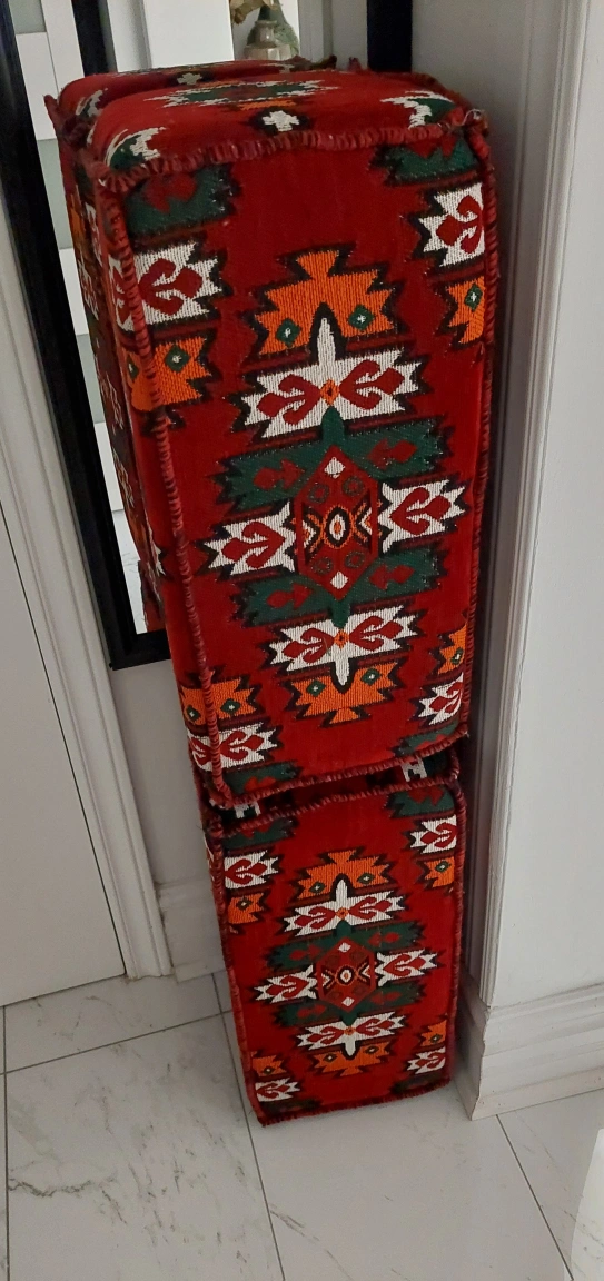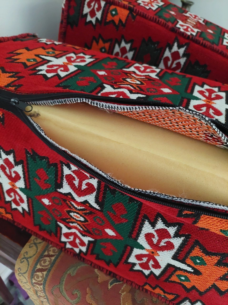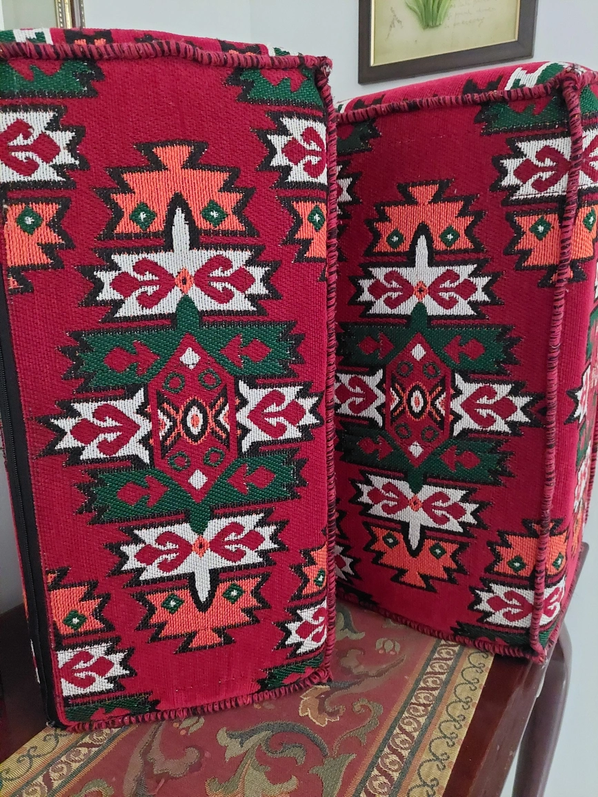 Selling a set of two arm rest cushions with a unique red patterned design! They have a zipper closure and are filled with foam. Perfect for adding a touch of style and comfort to your space.