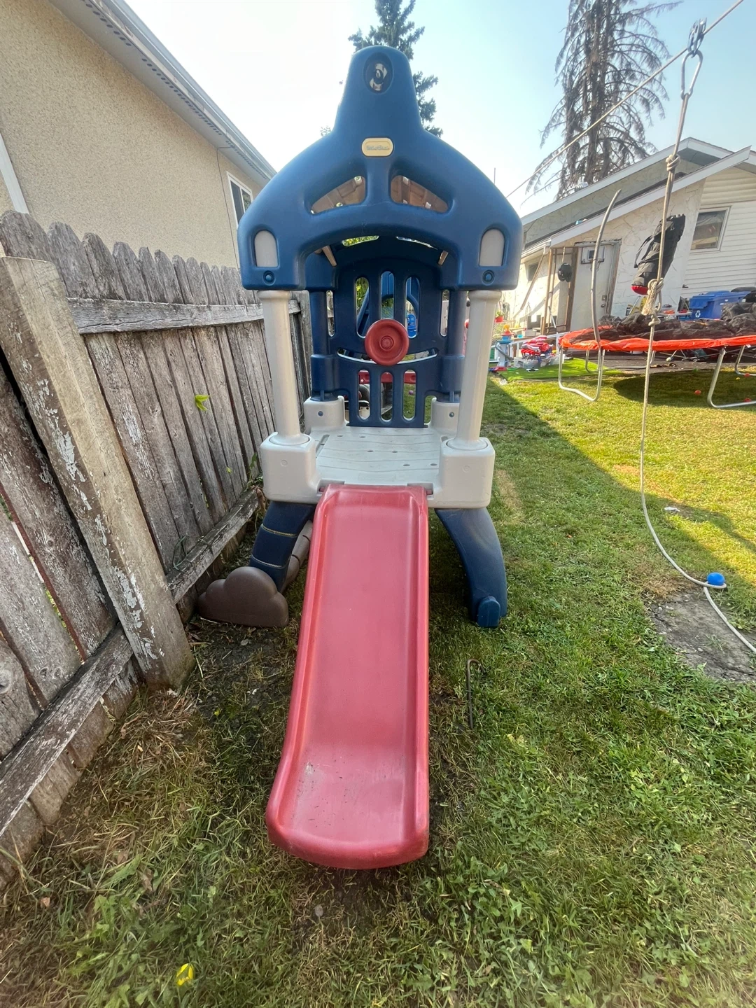 A fun playset for kids, featuring a slide and swing! It's in good condition and ready for a new home. Perfect for backyard fun! Does not come with the swings but easy to find and purchase separately great condition