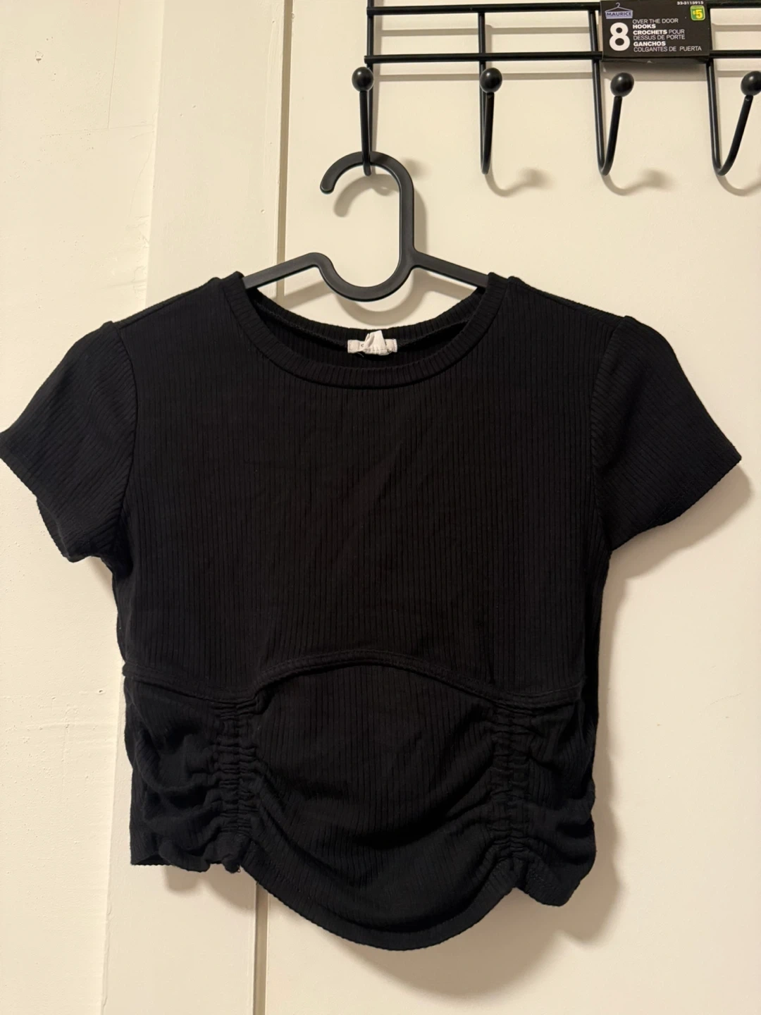 Selling a cute black top from Garage in size XS! It's in great condition and has a unique design with ruching at the bottom. Perfect for a night out or dressing up a casual outfit!