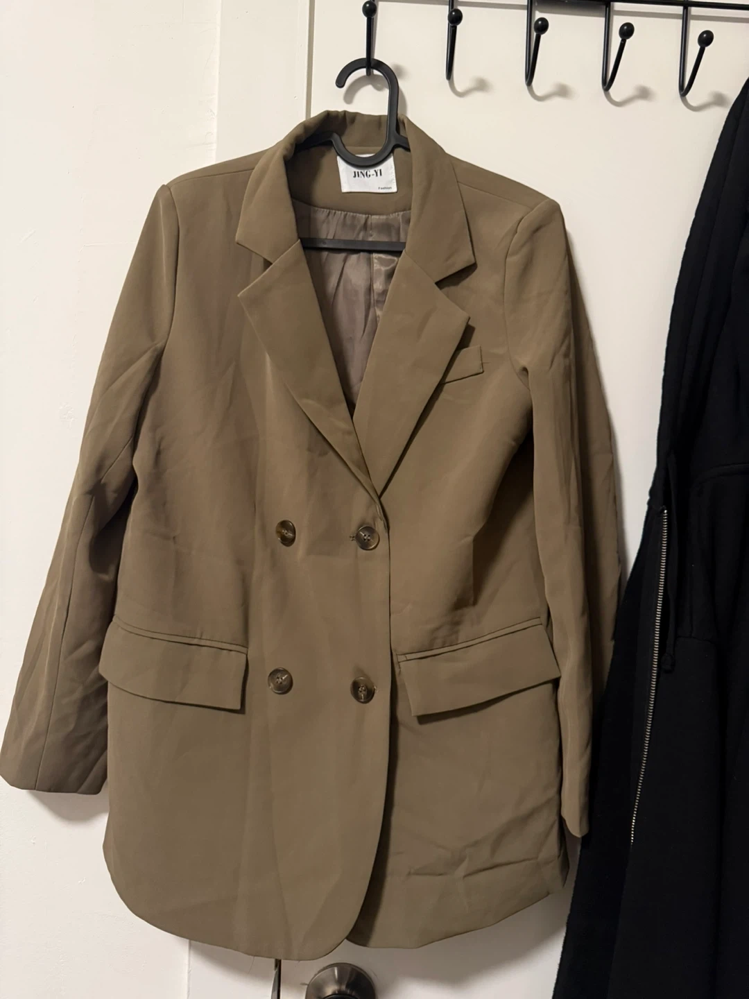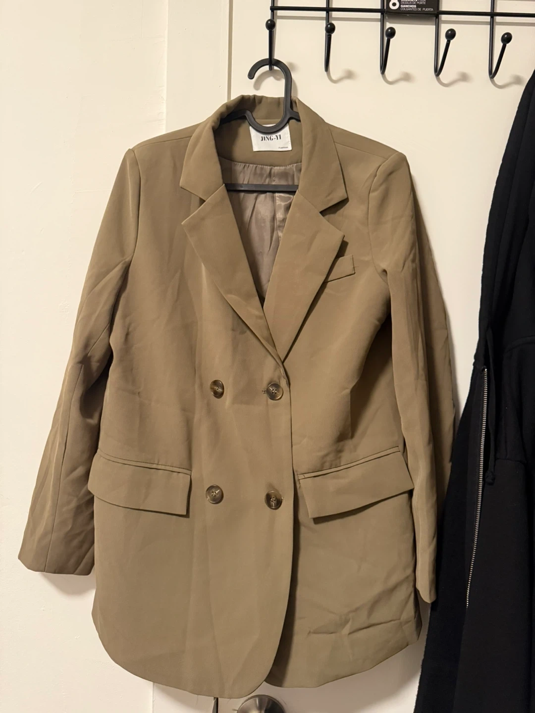 Selling a stylish brown double-breasted blazer in size M. It's in great condition and ready to add a touch of sophistication to your wardrobe! Perfect for layering or wearing on its own