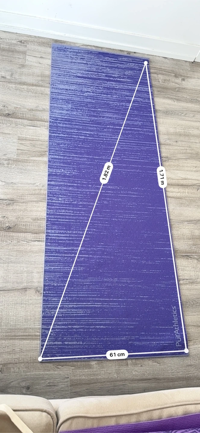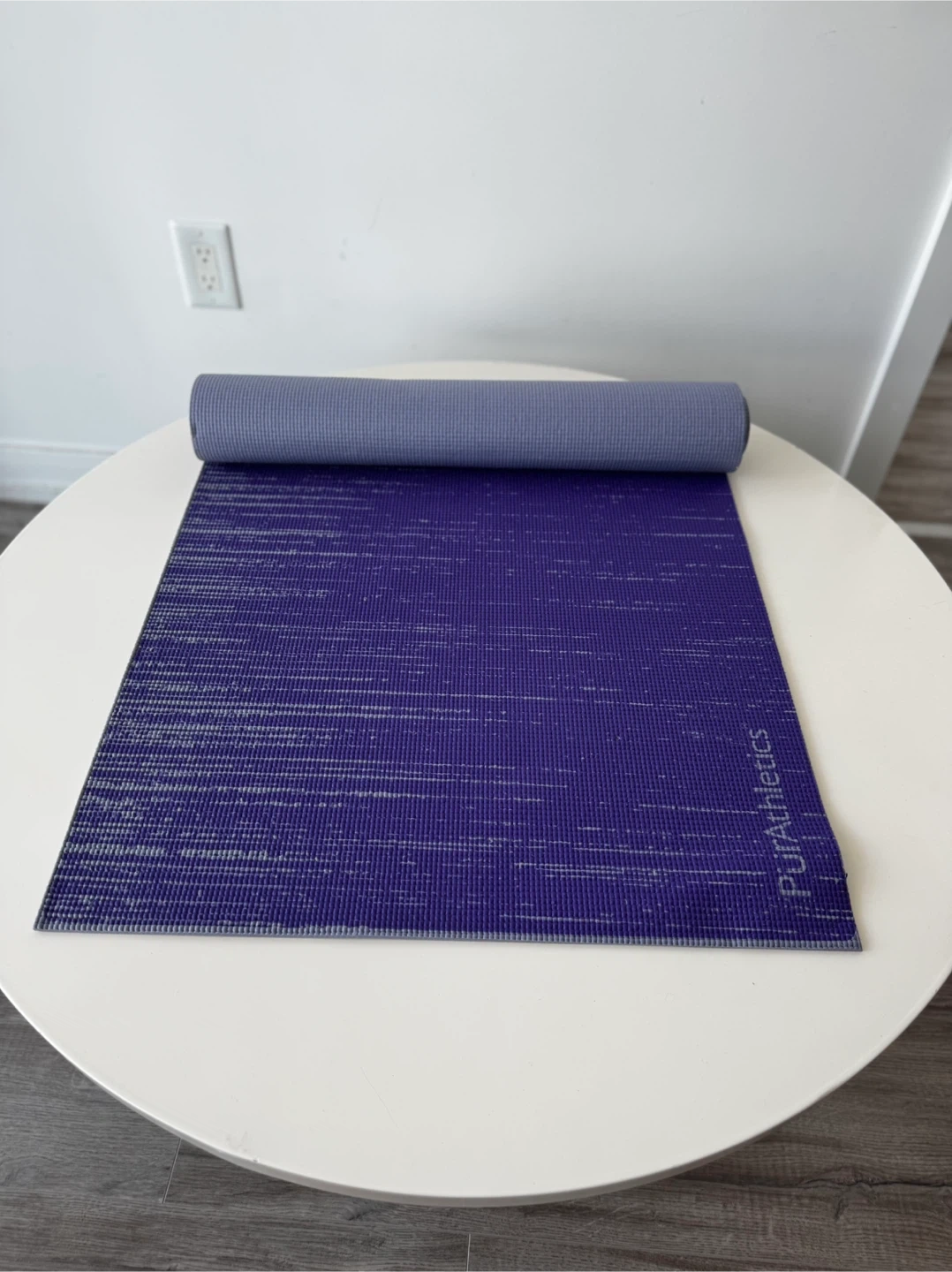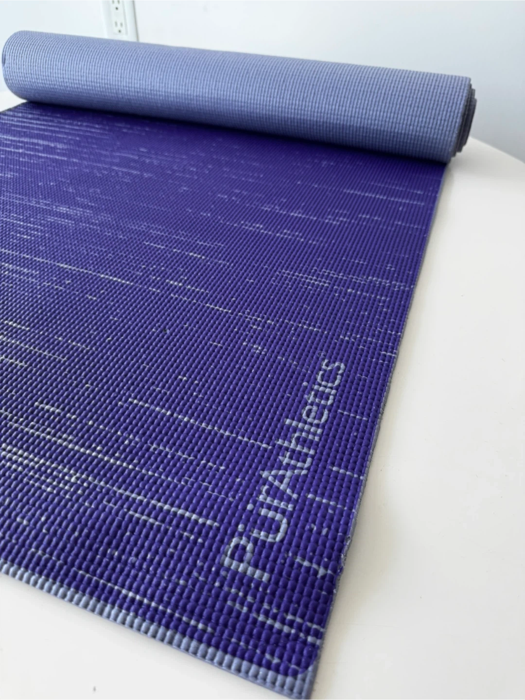 This Pur Athletics yoga mat is perfect for your home workouts or taking to the studio! It's in great shape and ready for a new owner. The approximate dimensions are 182cm x 61cm x 1.71cm