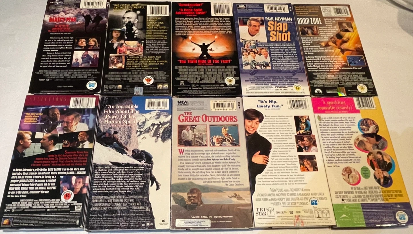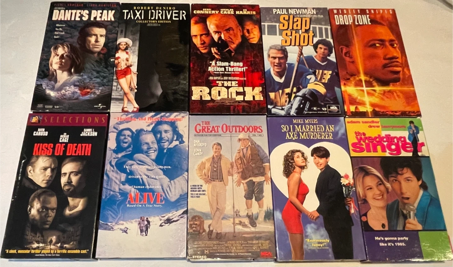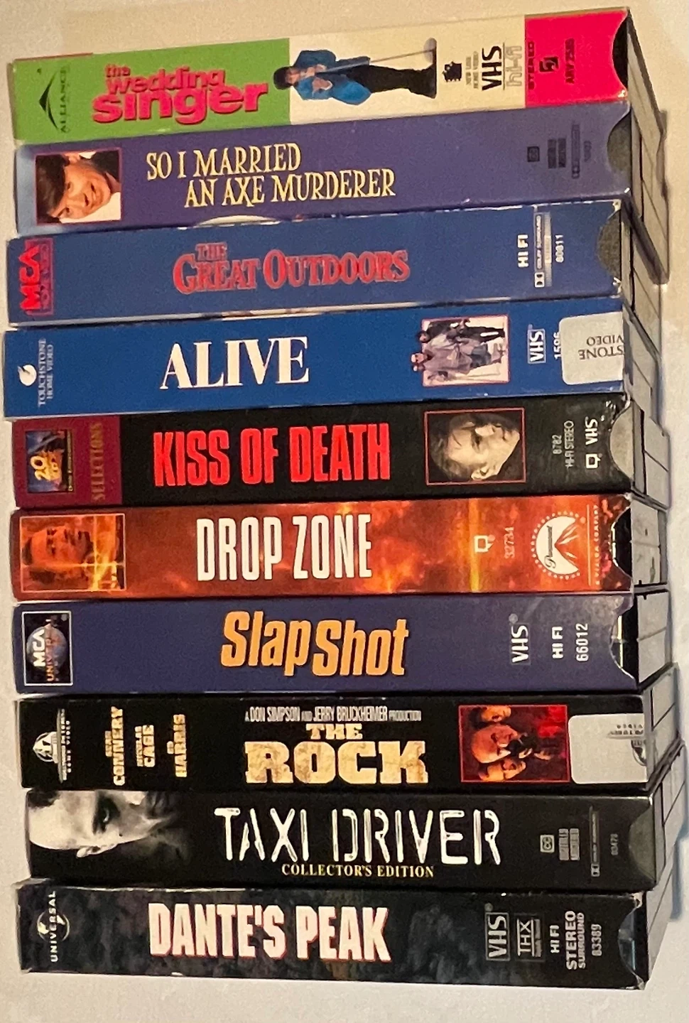 Selling a collection of VHS tapes, including titles like The Wedding Singer, So I Married an Axe Murderer, The Great Outdoors, Alive, Kiss of Death, Drop Zone, Slap Shot, The Rock, Taxi Driver, Dante's Peak, Ace Ventura, The Waterboy, Dr. Dolittle, Planes Trains and Automobiles, and Ferris Bueller's Day Off