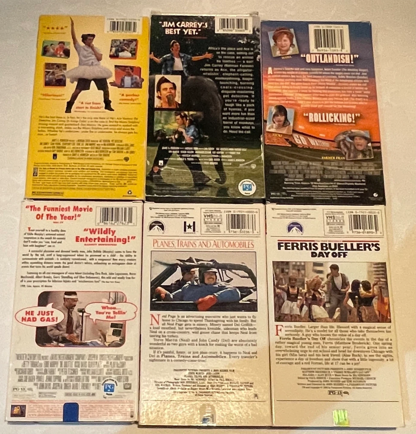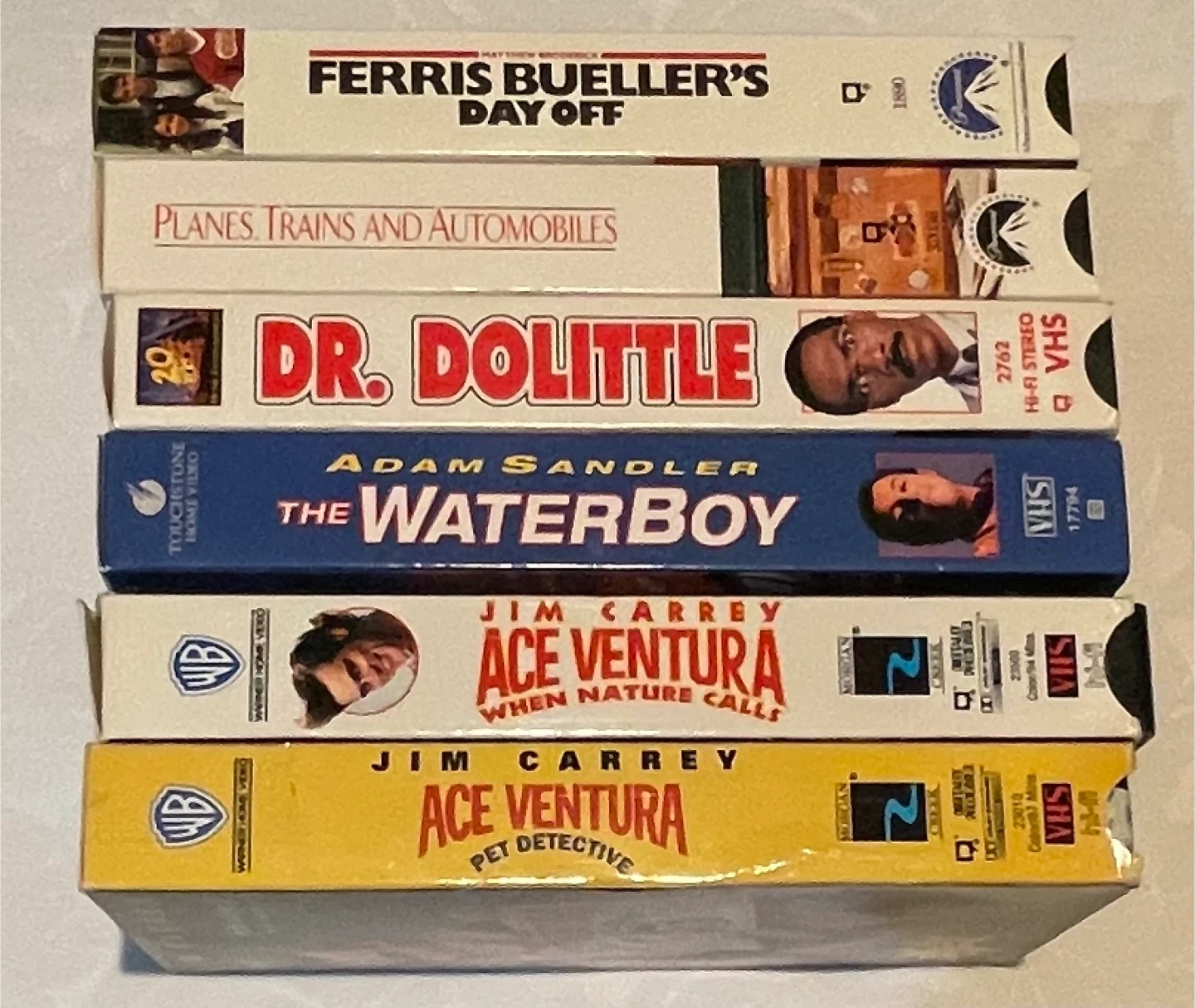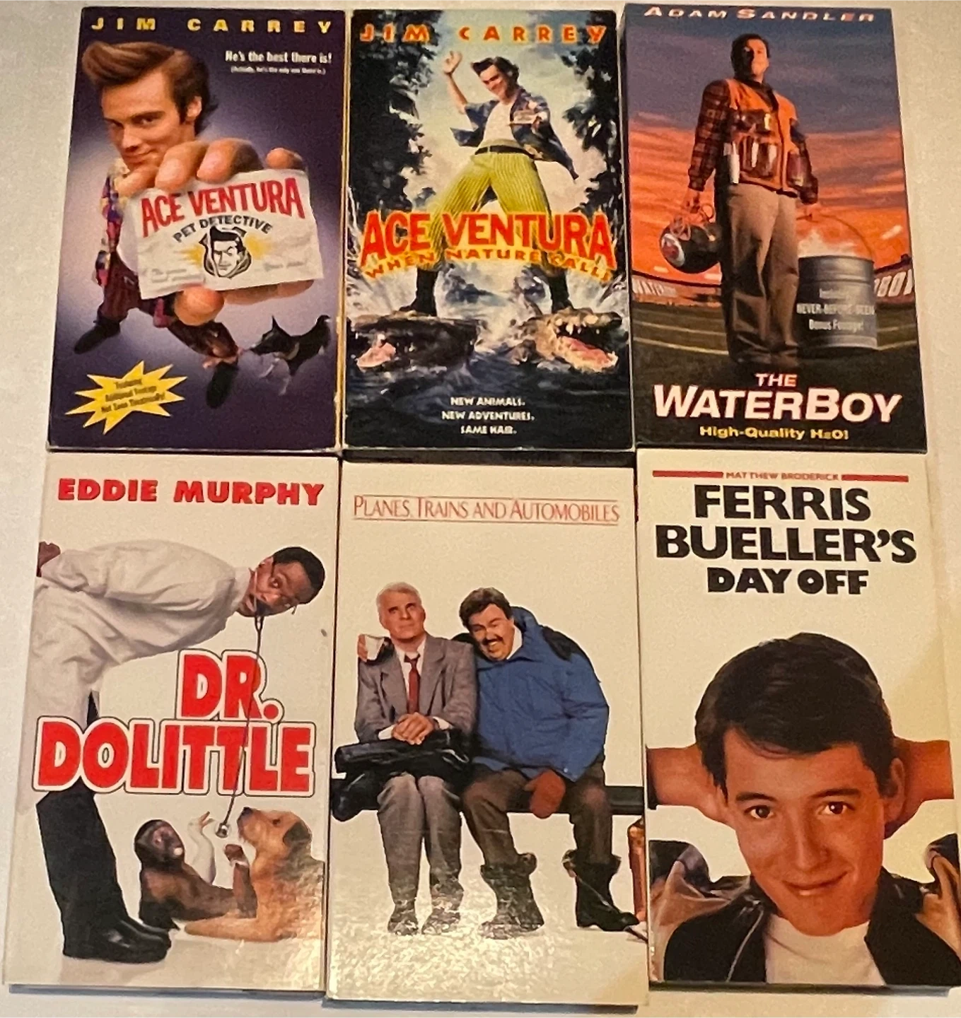 Selling a collection of VHS tapes, including titles like The Wedding Singer, So I Married an Axe Murderer, The Great Outdoors, Alive, Kiss of Death, Drop Zone, Slap Shot, The Rock, Taxi Driver, Dante's Peak, Ace Ventura, The Waterboy, Dr. Dolittle, Planes Trains and Automobiles, and Ferris Bueller's Day Off